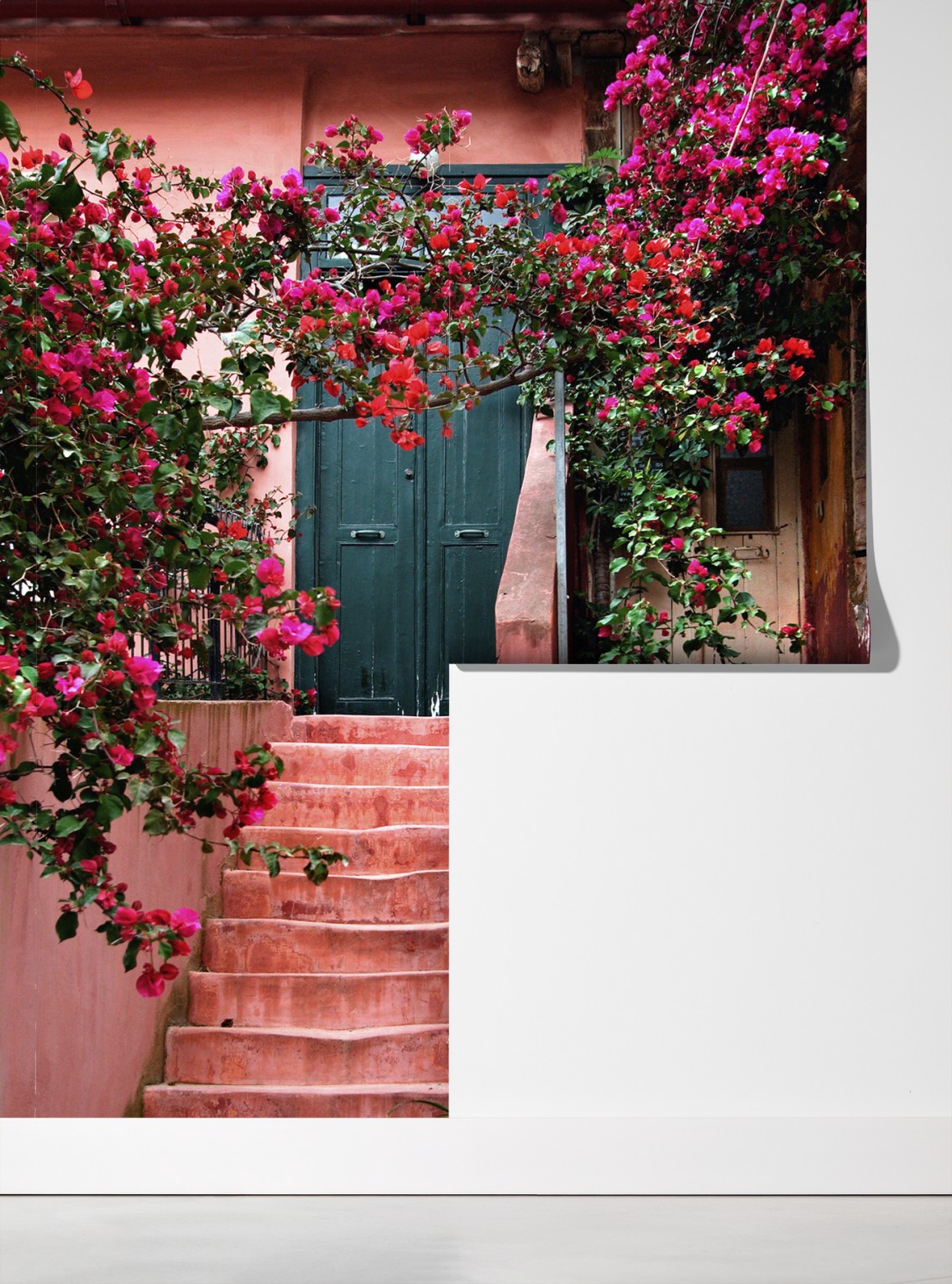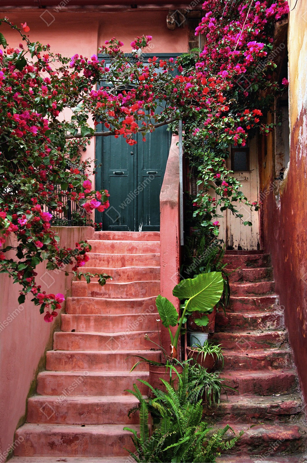 Wprowadź do wnętrza ciepły, boho klimat dzięki zdjęciu przedstawiającemu schody obsadzone bugenwillą i bujną roślinnością.