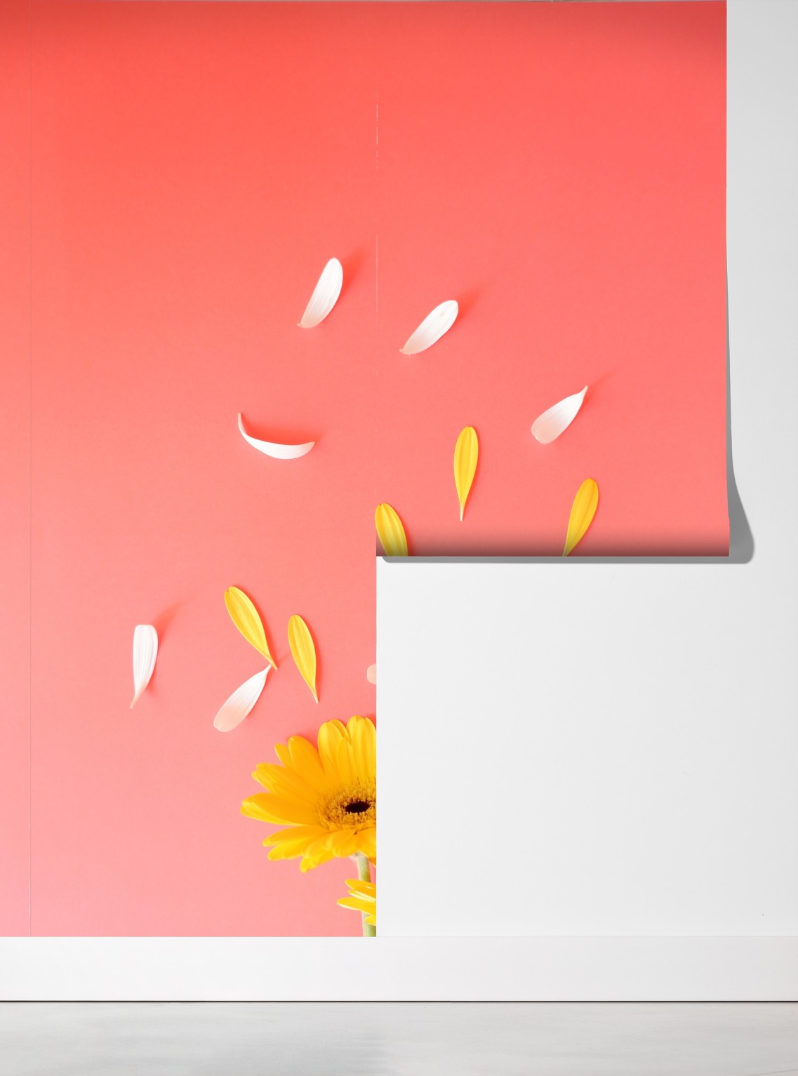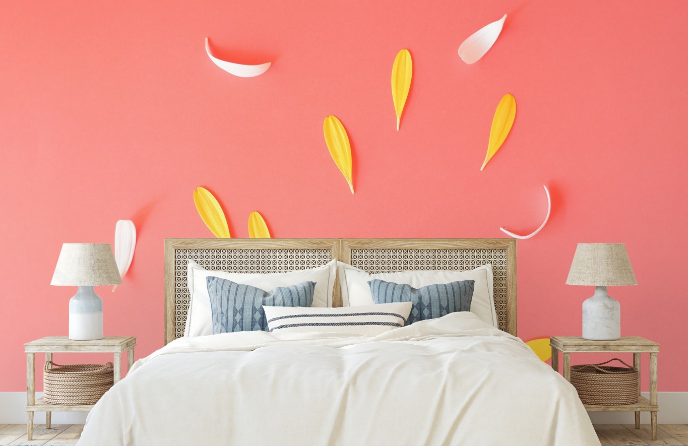 Rozjaśnij wnętrze radosnymi żółtymi gerberami na koralowym tle, minimalistyczny motyw kwiatowy dodający ciepła i nowoczesnego charakteru.