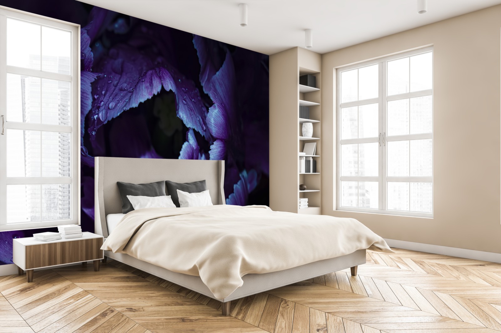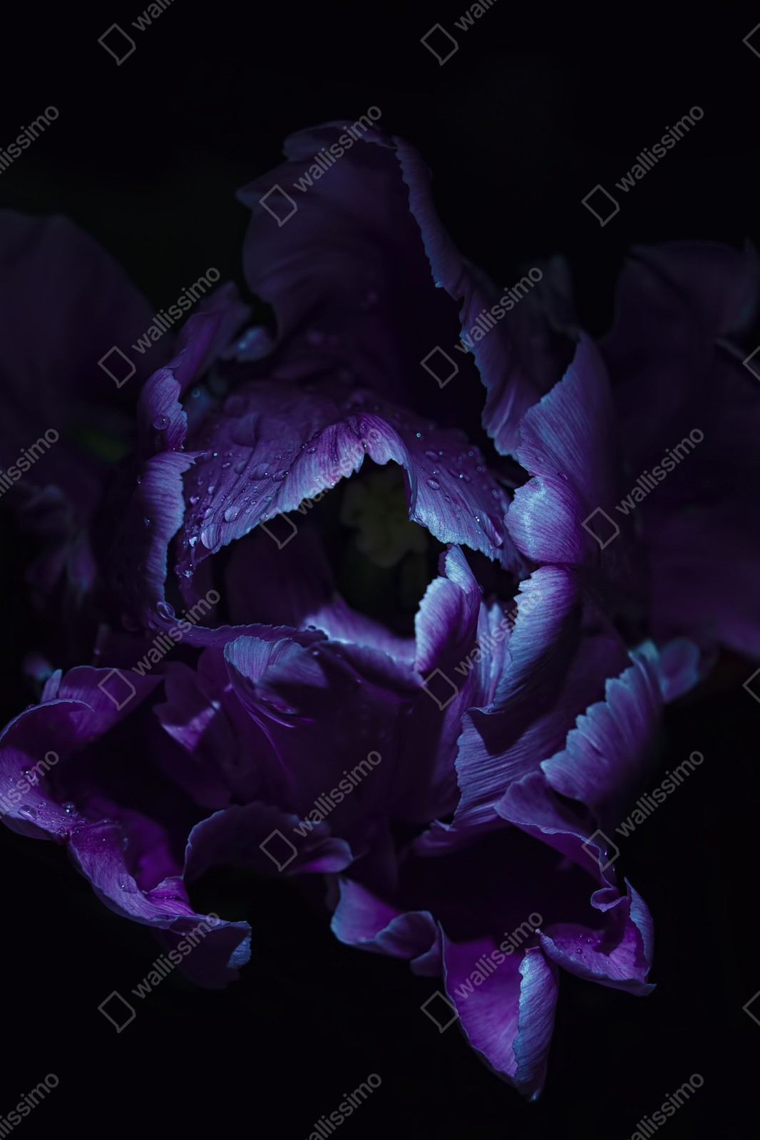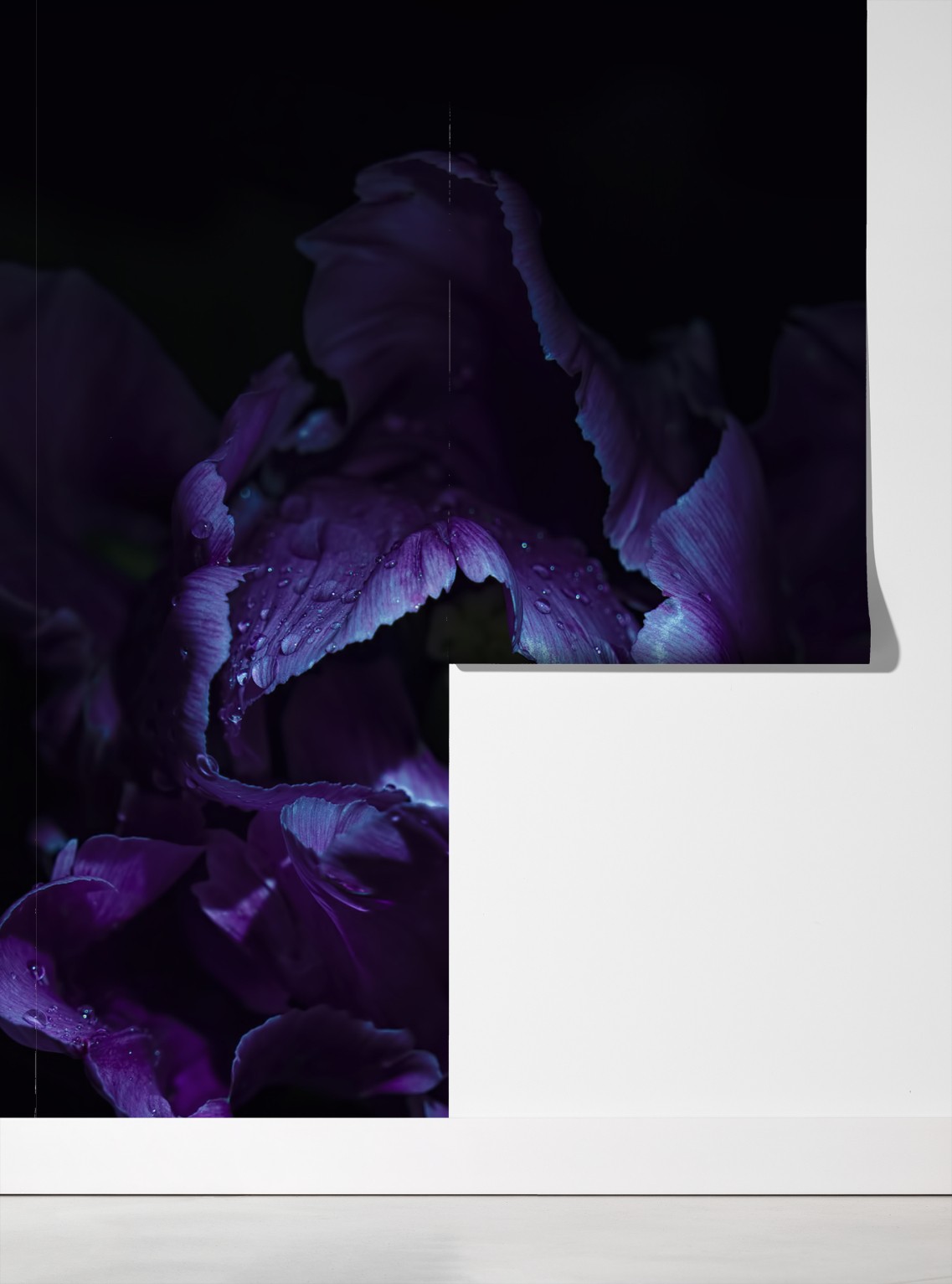 Dodaj dramatycznego kwiatowego uroku do wnętrza dzięki zbliżeniu fioletowego tulipana w ultrafiolecie, ukazującemu kropelki rosy i tekstury na ciemnym tle.