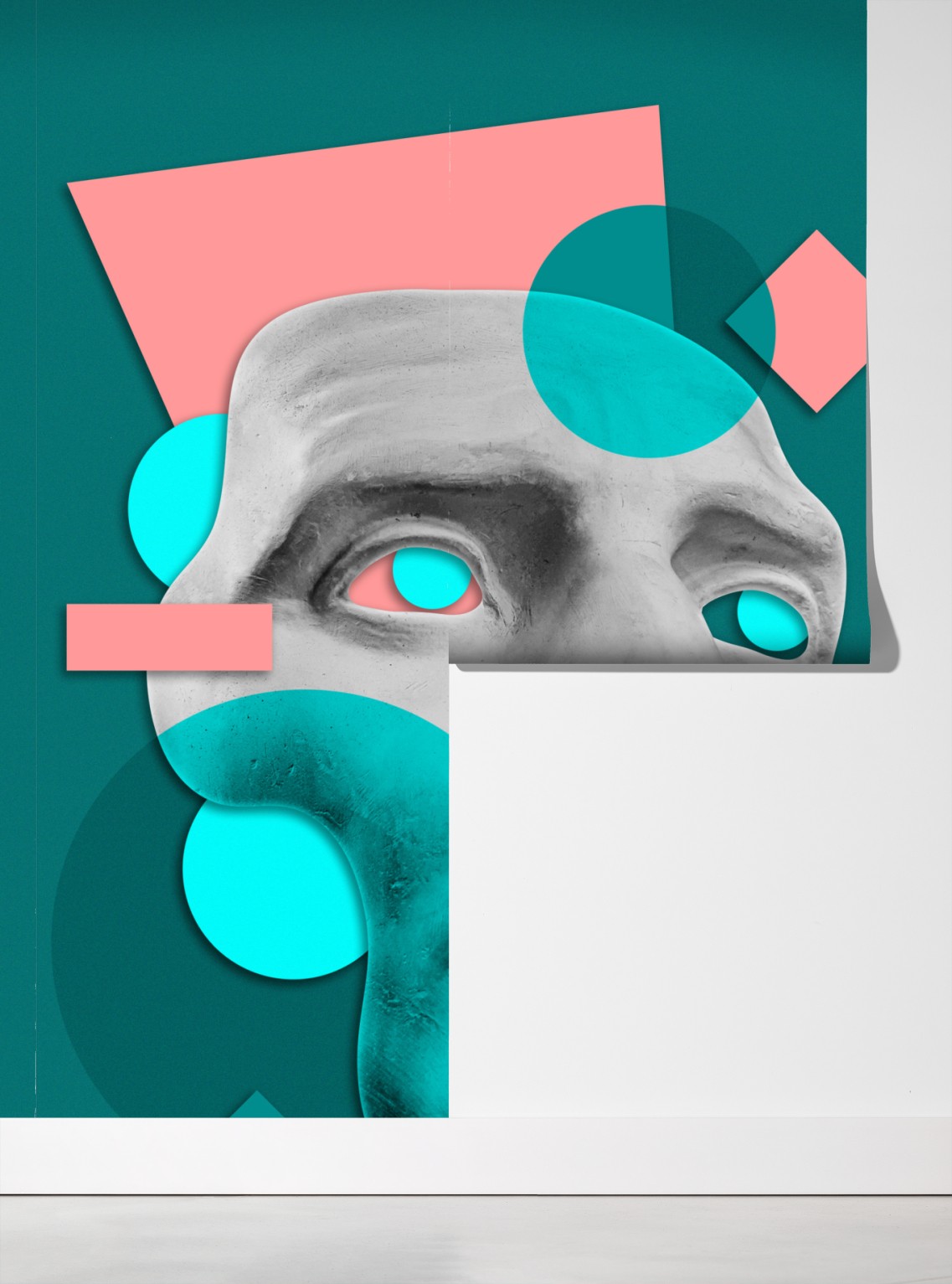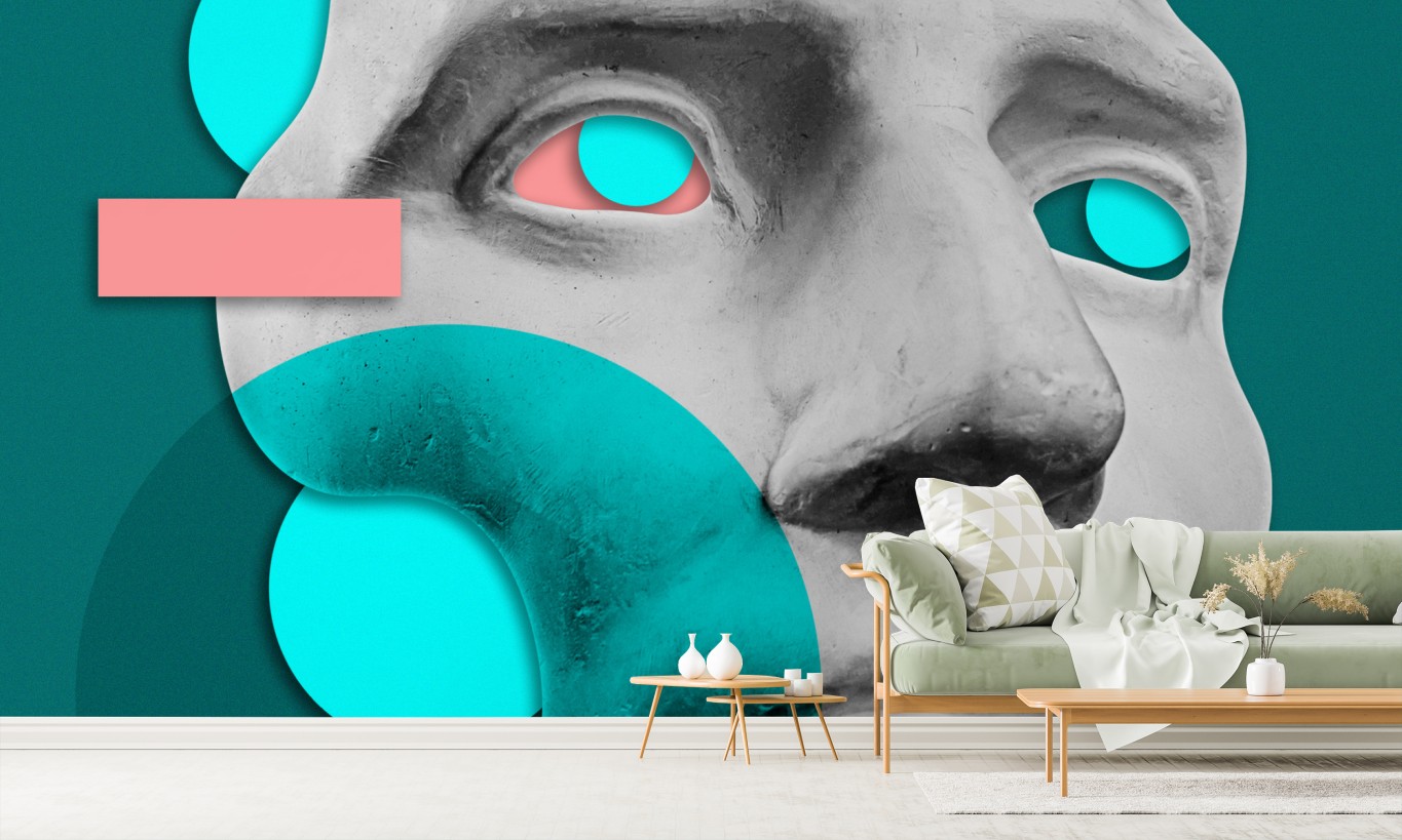 Wyrazista kompozycja łączy klasyczną rzeźbę z nowoczesnymi kształtami i kolorami, idealna jako dekoracja ścienna.