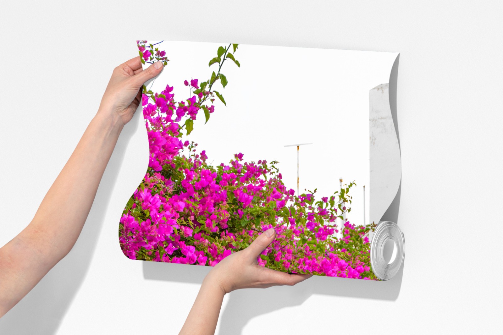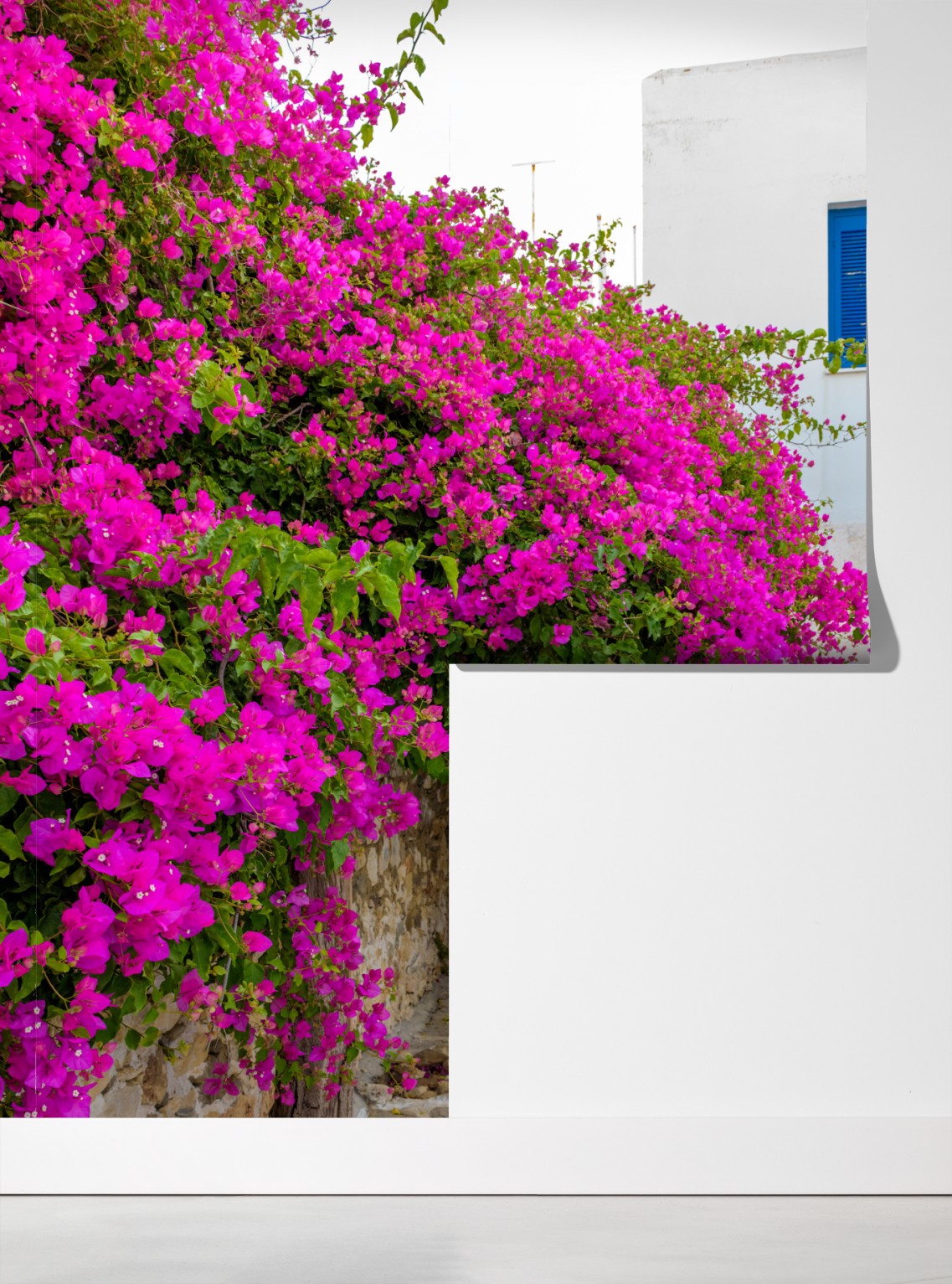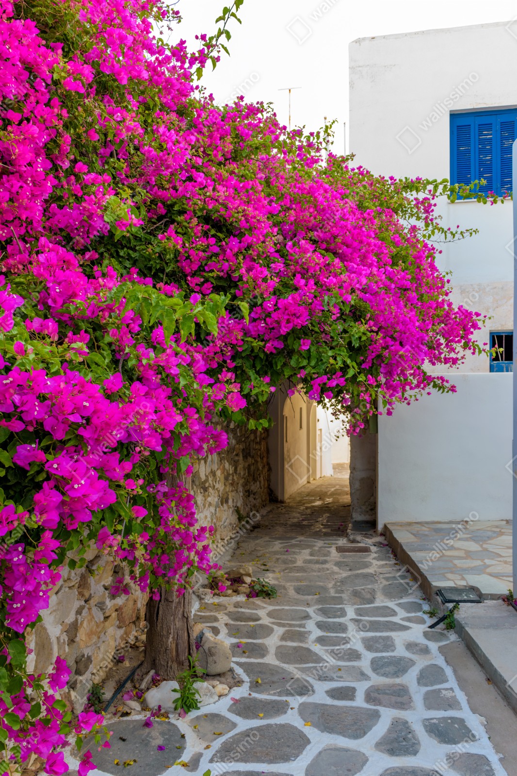 Wprowadź do wnętrza radosny klimat cykladzkiej uliczki z bielonymi domami i intensywną bugenwillą z Naousa na Paros.