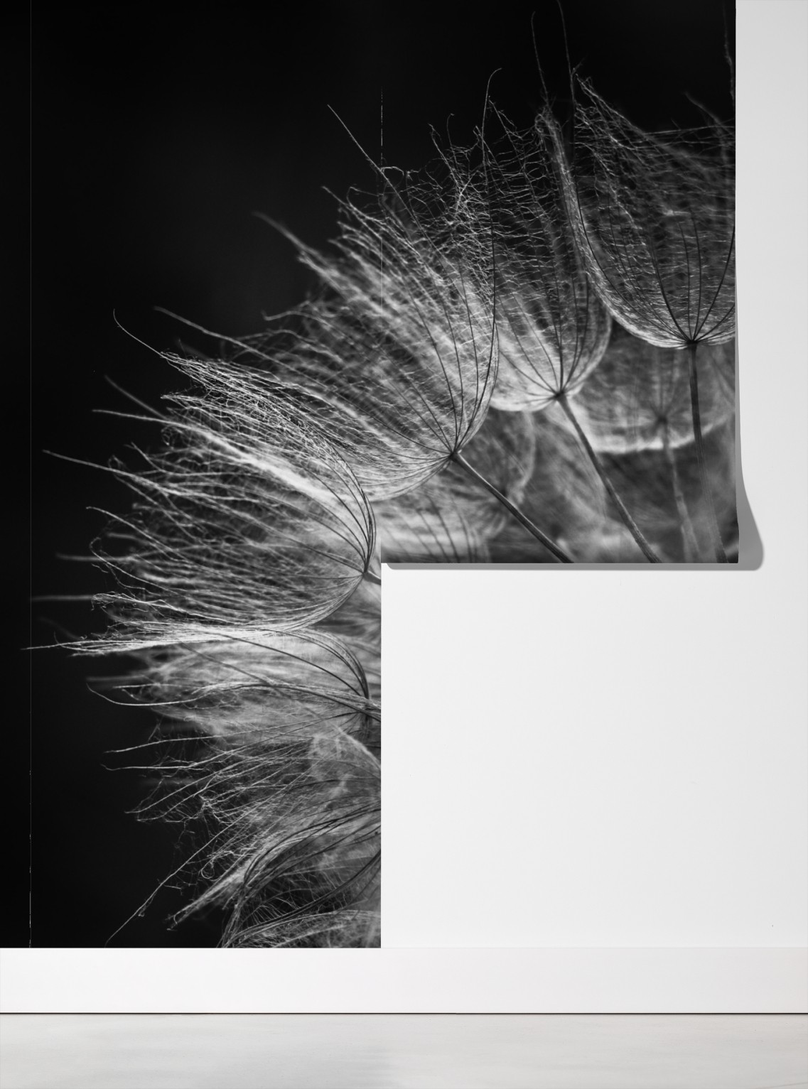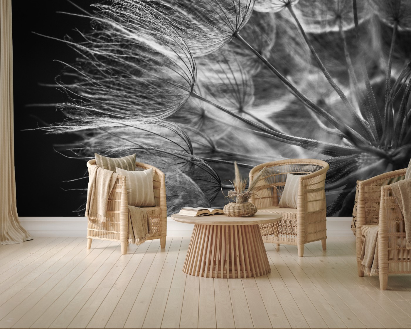 Delikatne, czarno-białe zbliżenie dmuchawca, które wprowadza subtelną botaniczną elegancję do wnętrza.