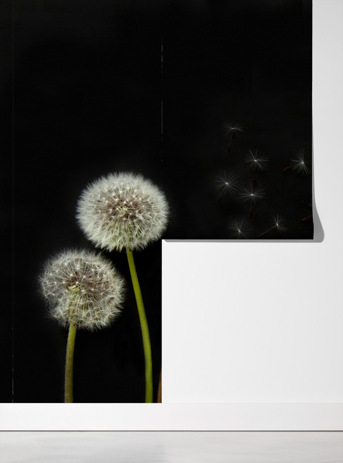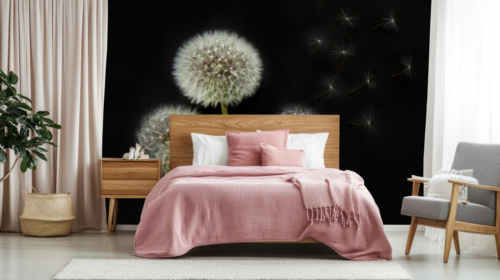 Delikatne nasiona mniszka unoszą się na głębokim czarnym tle, tworząc minimalistyczny i uspokajający motyw botaniki idealny do nowoczesnych wnętrz.