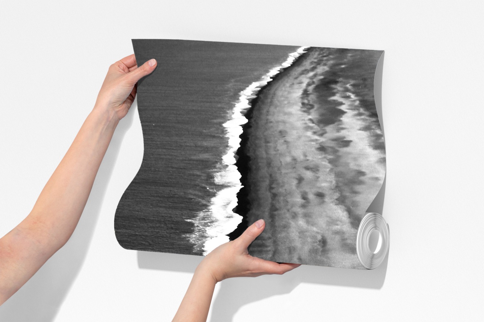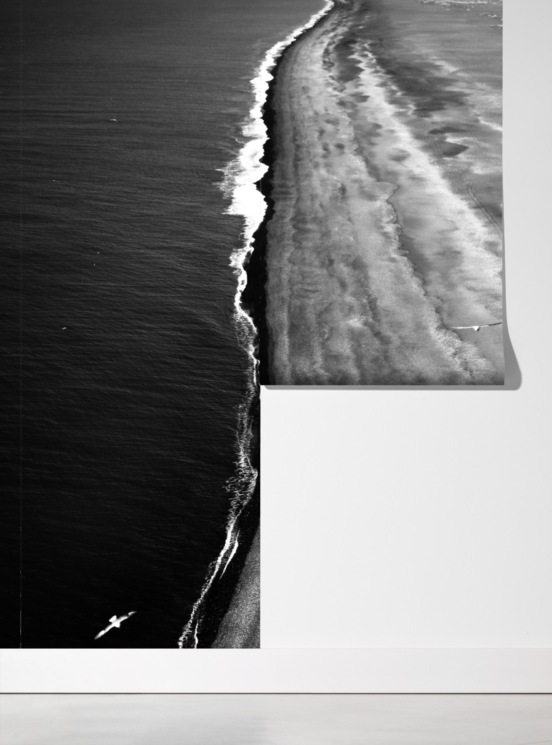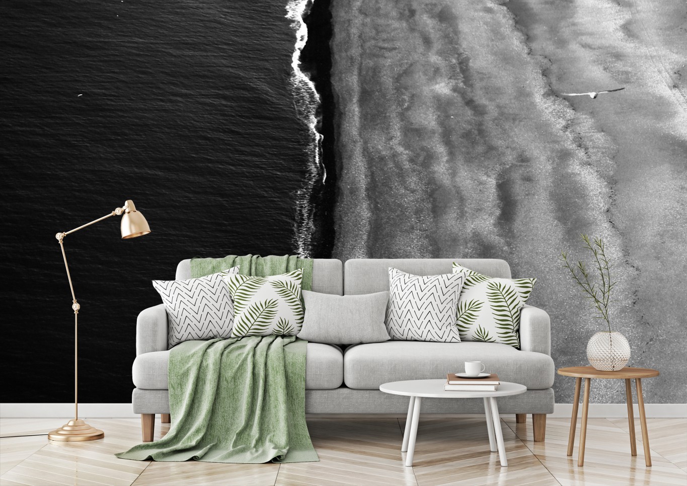Dodaj elegancki akcent do wnętrza dzięki temu minimalistycznemu, monochromatycznemu ujęciu plaży z mewami w locie.