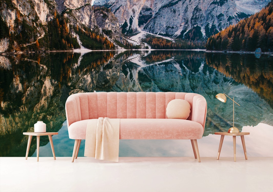 Fototapeta Spokojne alpejskie jezioro z drewnianym pomostem