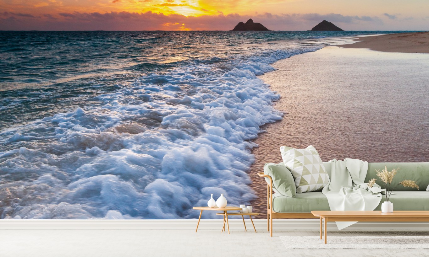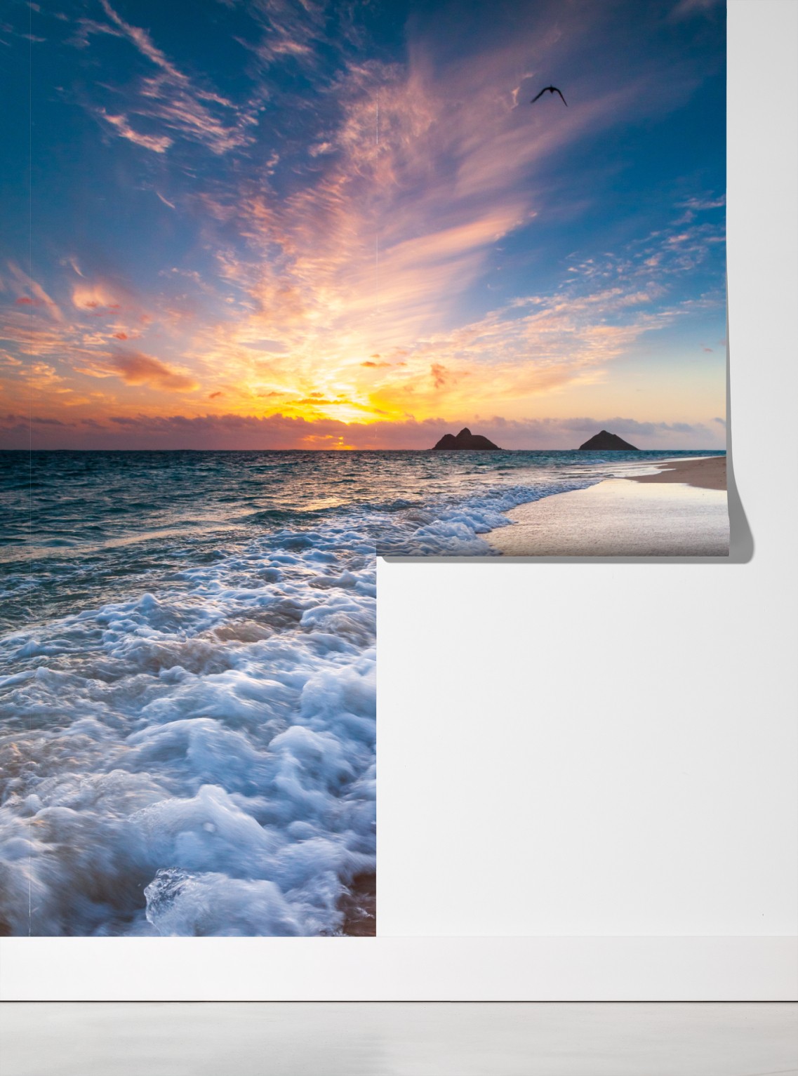 Wprowadź do wnętrza uspokajającą atmosferę nadmorskiego poranka z tym żywym pejzażem przedstawiającym delikatne fale i kolorowe niebo.