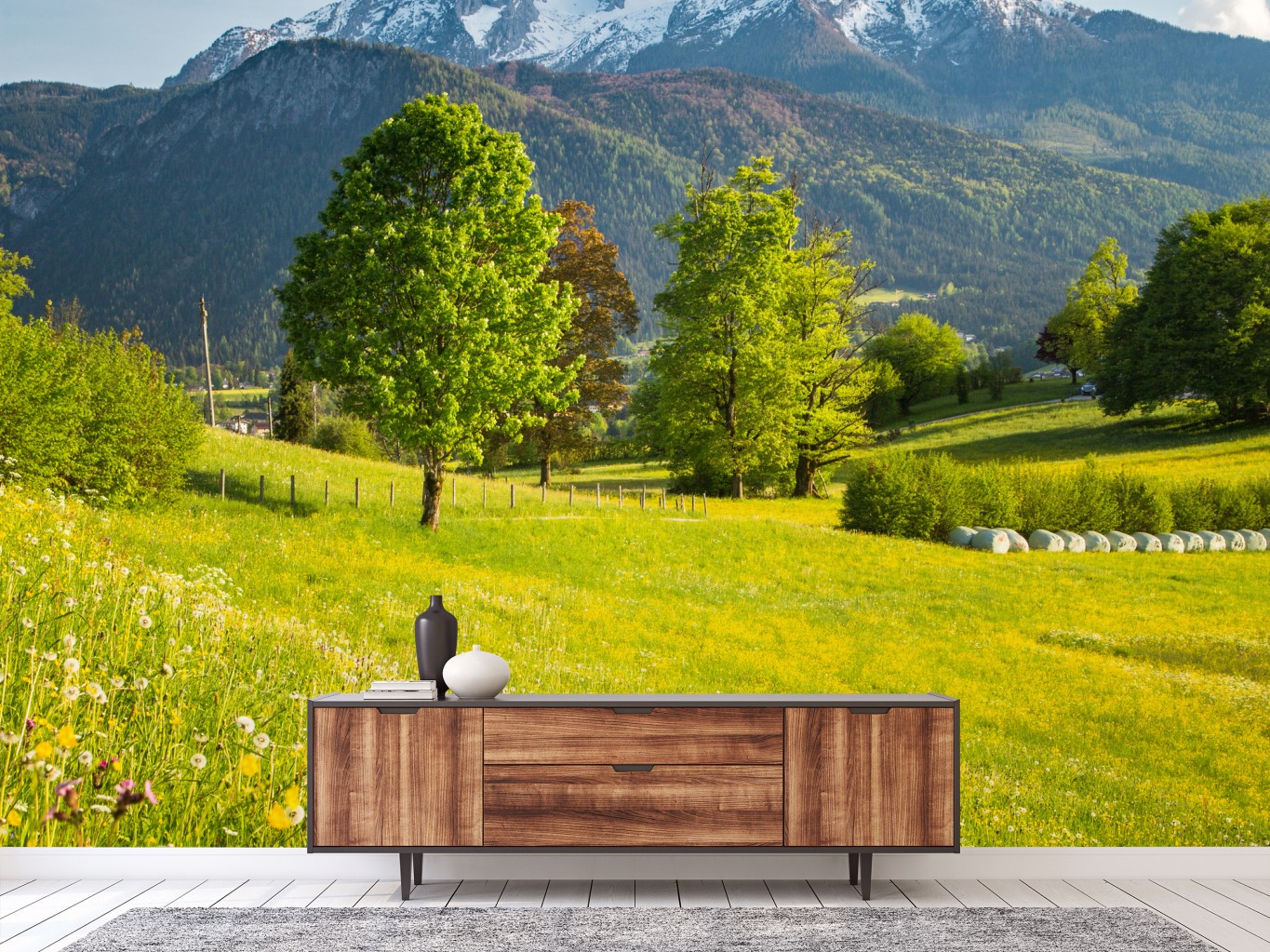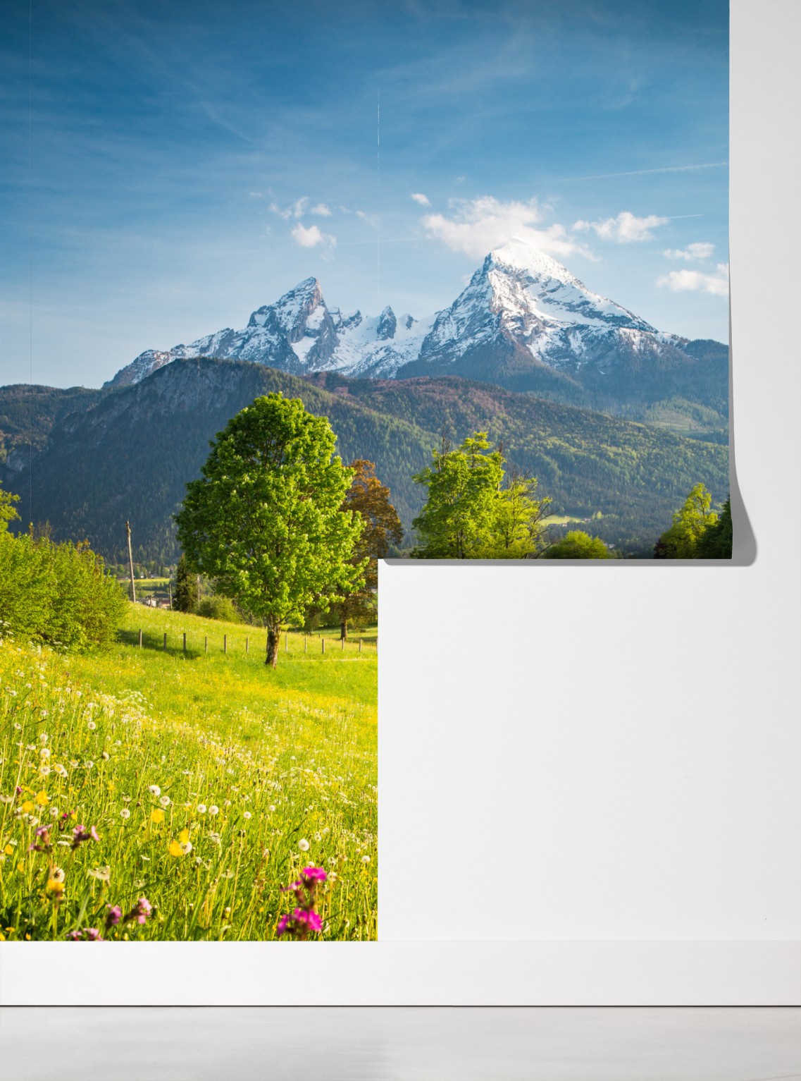 Wprowadź spokój alpejskich łąk i śnieżnych szczytów do swojego wnętrza dzięki temu żywemu wiosennemu krajobrazowi.