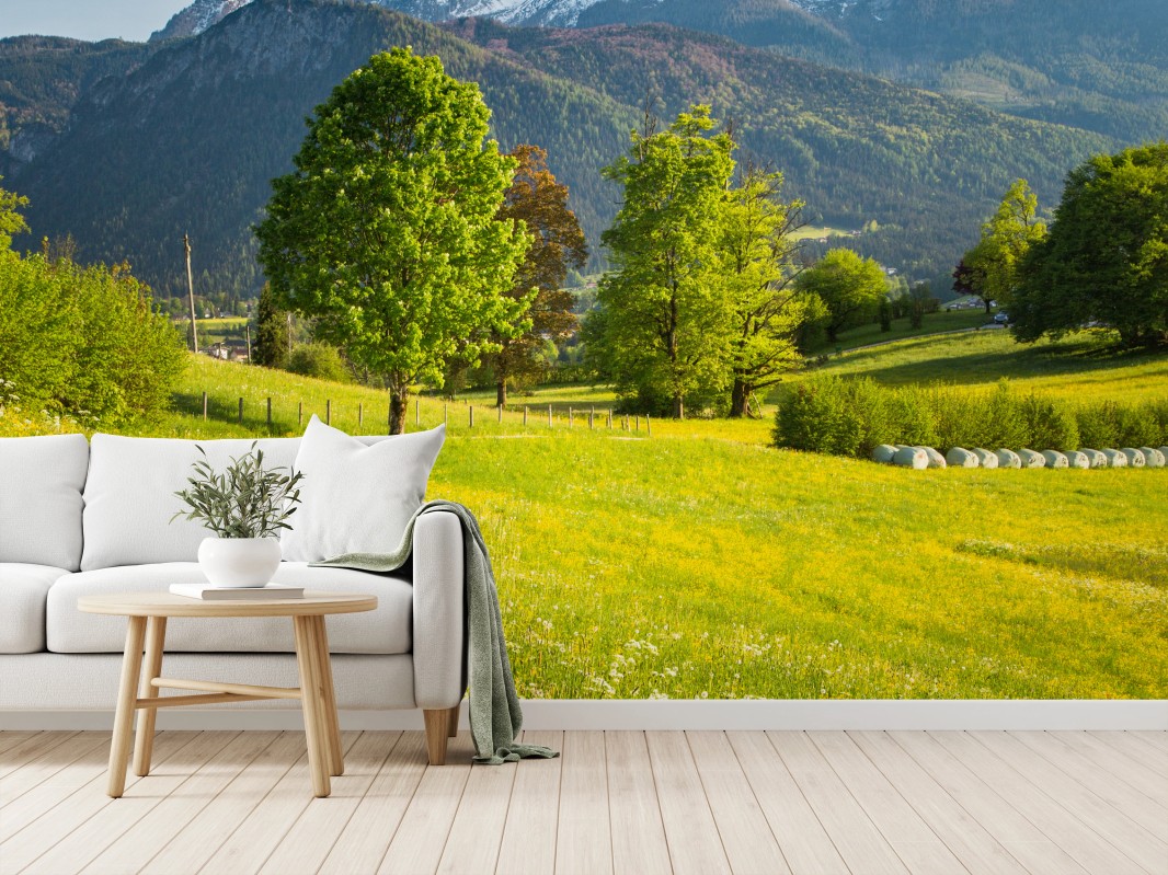 Fototapeta Alpejska wiosenna łąka pod śnieżnymi szczytami