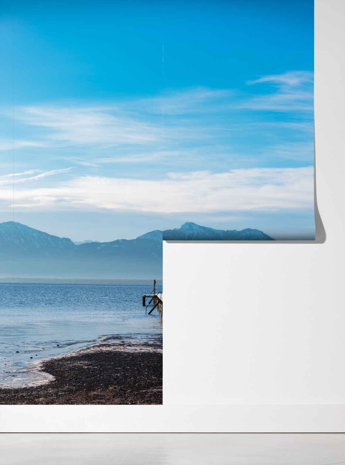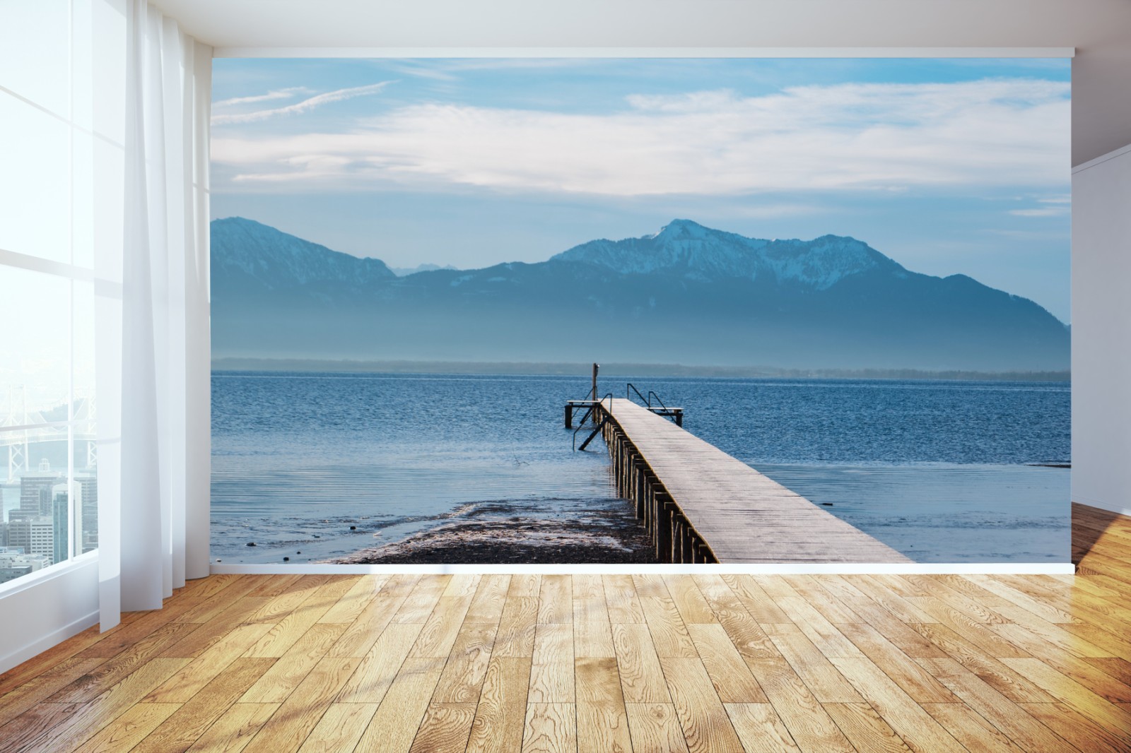 Wprowadź spokój i naturalne piękno do wnętrza dzięki temu spokojnemu pomostowi nad jeziorem z ośnieżonymi górami w tle, idealnemu jako centralny akcent.