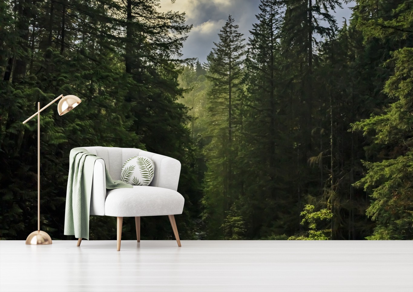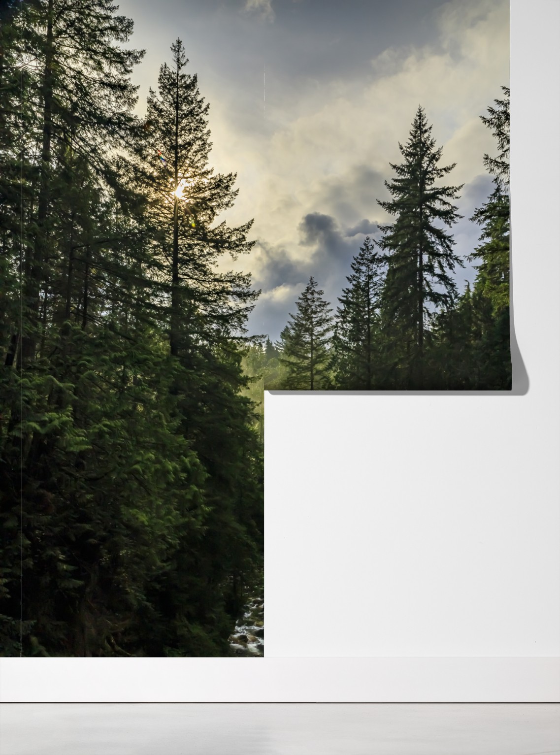 Wprowadź kojącą atmosferę mglistych iglastych lasów do wnętrza dzięki temu pionowemu motywowi przyrodniczemu z ukrytym wodospadem i promieniami słońca.