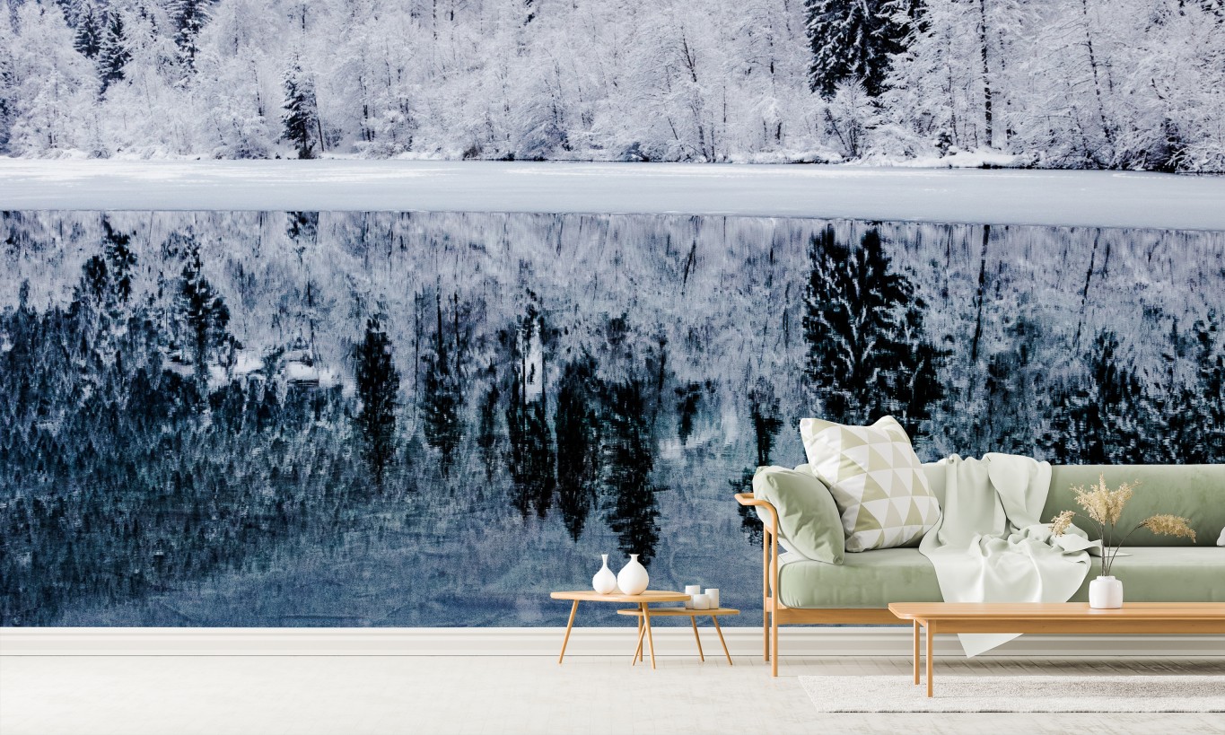 Poczuj zimowy spokój dzięki temu obrazowi przedstawiającemu jezioro i śnieżny las w odbiciu, idealny do minimalistycznych wnętrz.