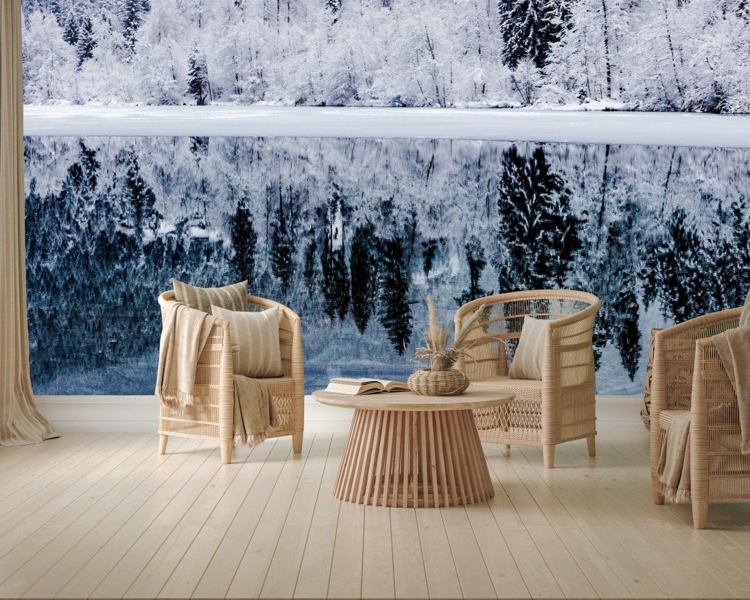 Fototapeta Zimowe jezioro z odbiciem w śnieżnym lesie