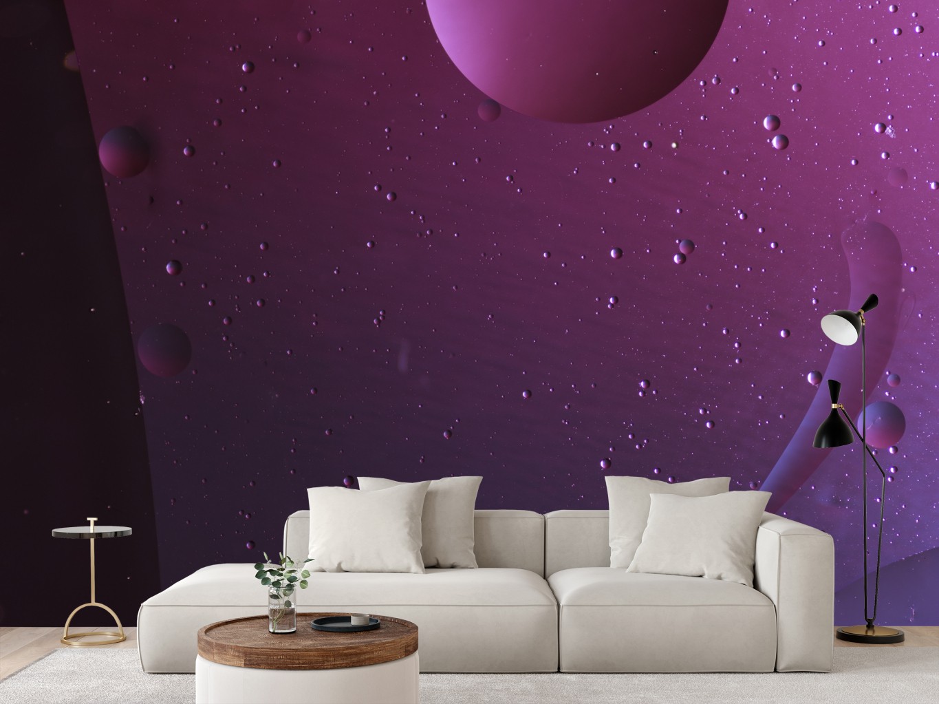 Dodaj nutę nowoczesnej tajemnicy do wnętrza dzięki wirującym fioletowym sferom i kosmicznym fakturom, idealne do współczesnych aranżacji.