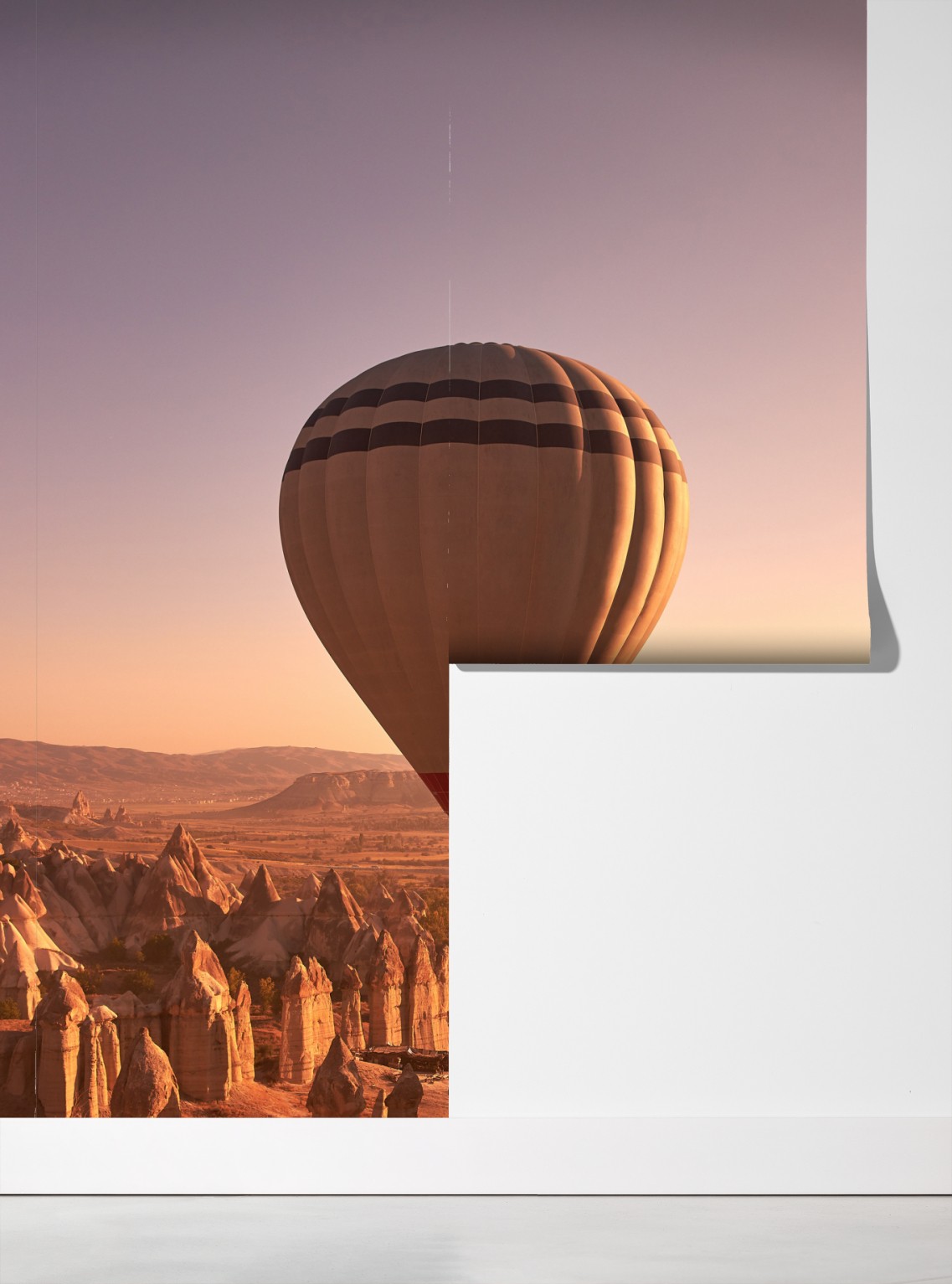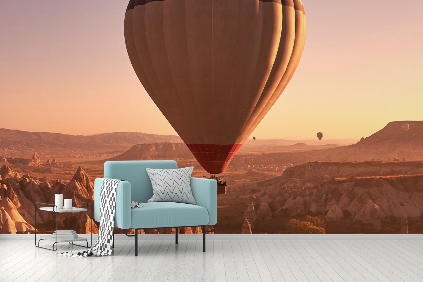 Odkryj spokojne piękno Kapadocji o świcie z unoszącym się balonem nad charakterystycznymi formacjami skalnymi, idealne do ocieplenia i dodania podróżniczego charakteru wnętrzu.