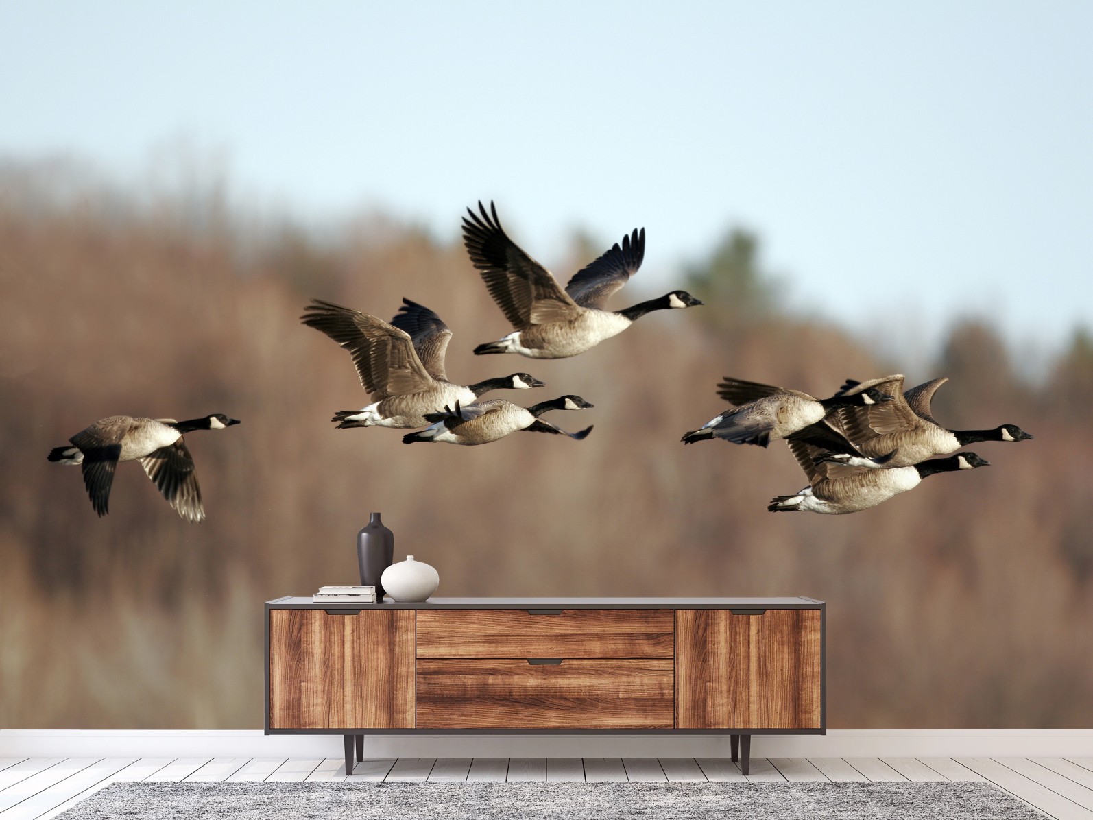 Fototapeta Gęsi w locie nad jesiennym mokradłem
