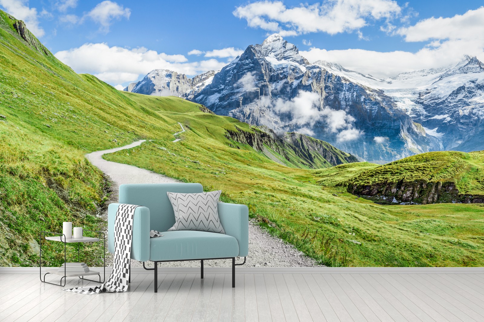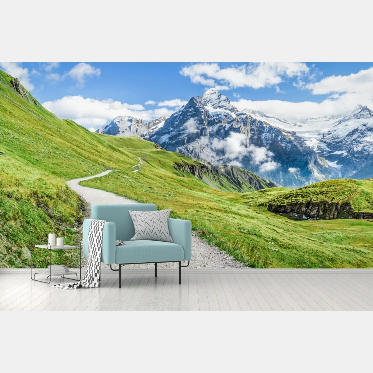 Zapierający dech w piersiach alpejski krajobraz z wijącą się ścieżką i ośnieżonymi szczytami, który tworzy uspokajający akcent w każdym wnętrzu.WięcejMniej