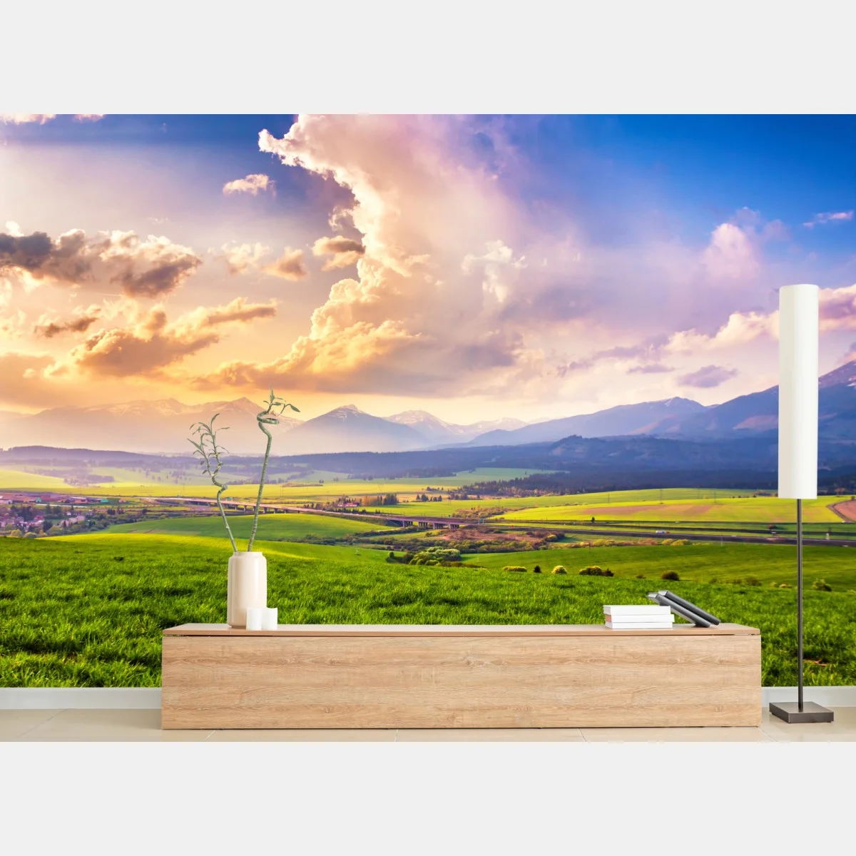 - panorama, góry, wschód słońca, łąka, wiosna, chmury, zielone pola, dolina, tatry, słowacja
