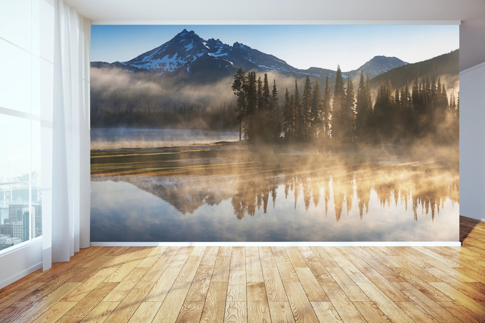 Fototapeta Mglisty wschód słońca nad górami z odbiciem