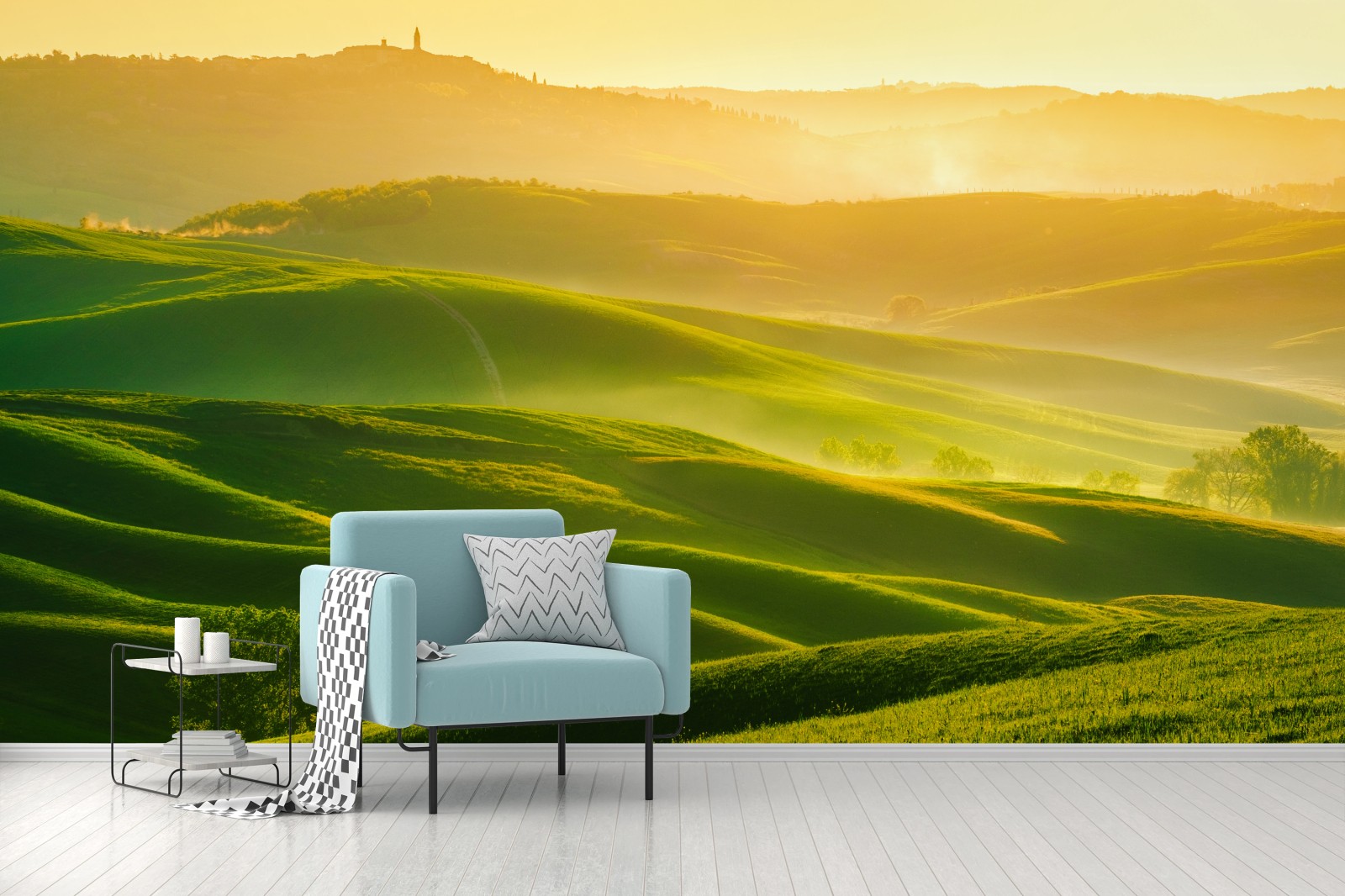 Fototapeta Złoty wschód słońca nad zielonymi falującymi wzgórzami