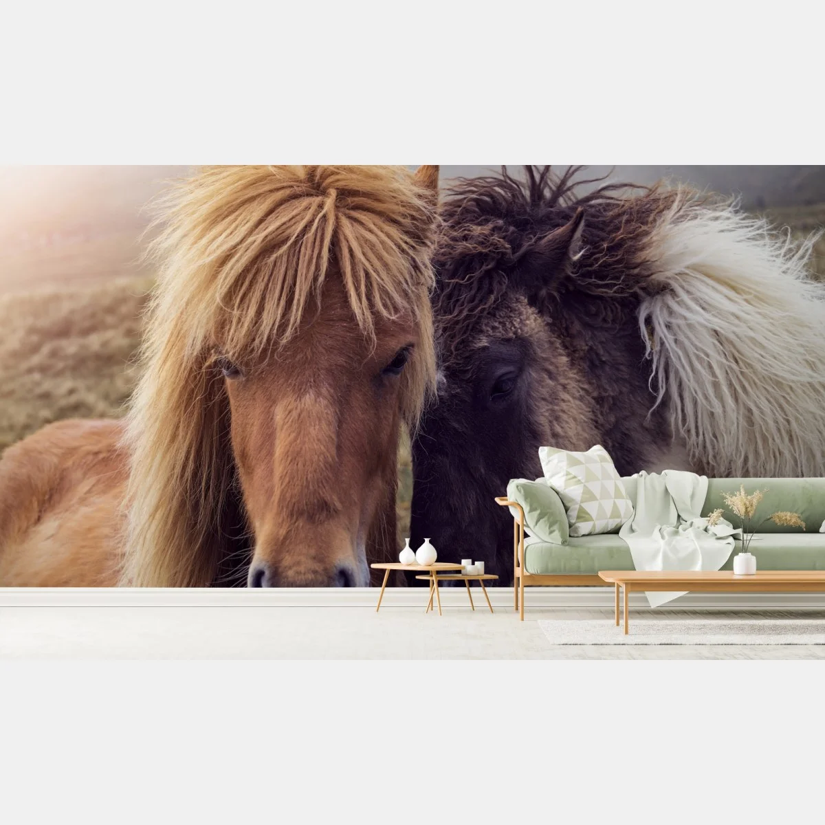 Fototapeta Dwa konie na mglistym wzgórzu, Wyspy Owcze