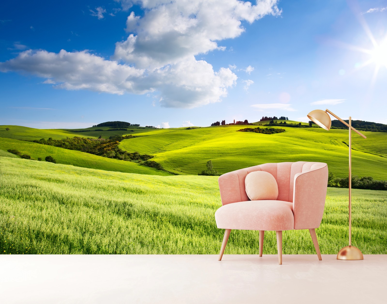 Fototapeta Toskania zielone wzgórza o zachodzie słońca
