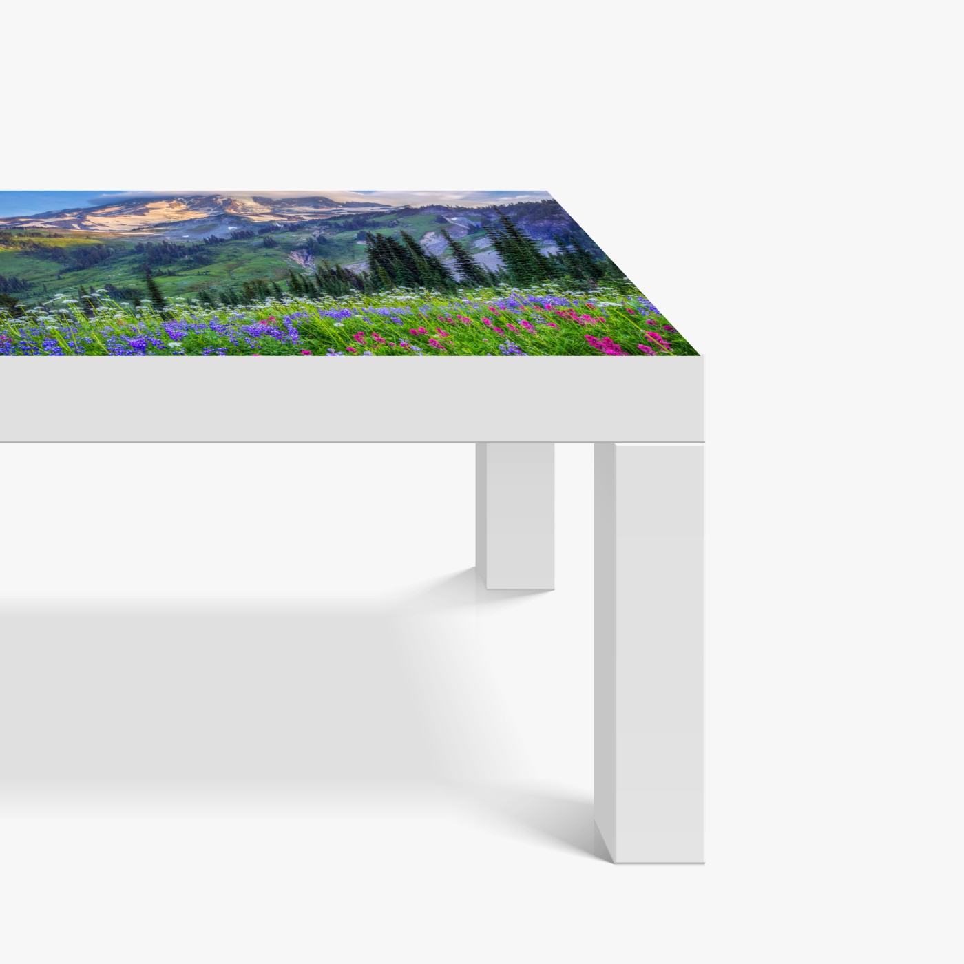 Naklejka na biurko i stół Alpejska łąka pełna kwiatów u stóp ośnieżonych szczytów