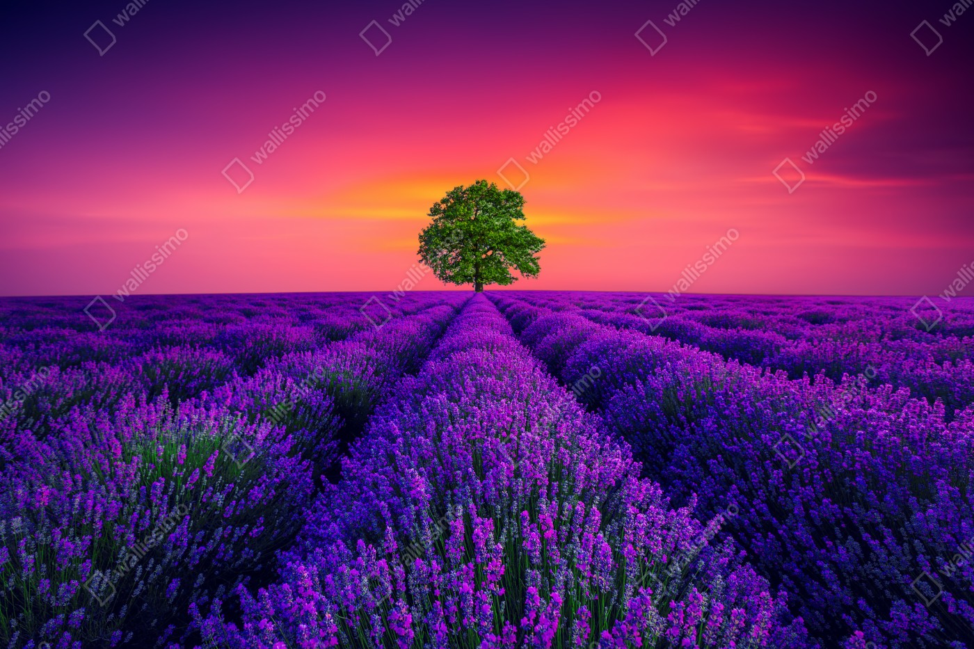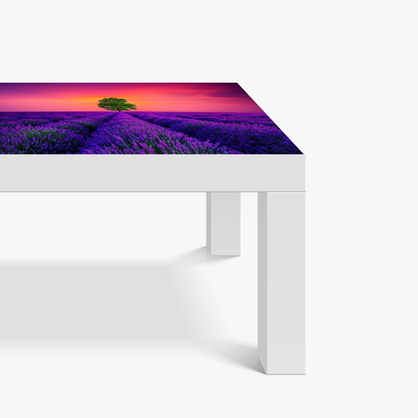 Naklejka na biurko i stół Pole lawendy o zachodzie słońca z samotnym drzewem
