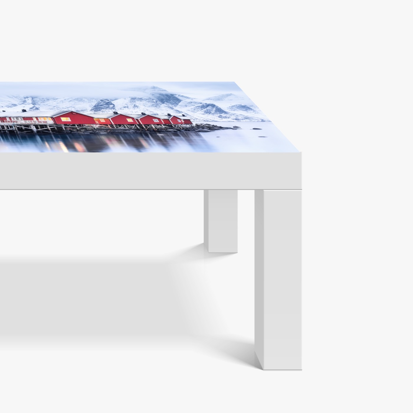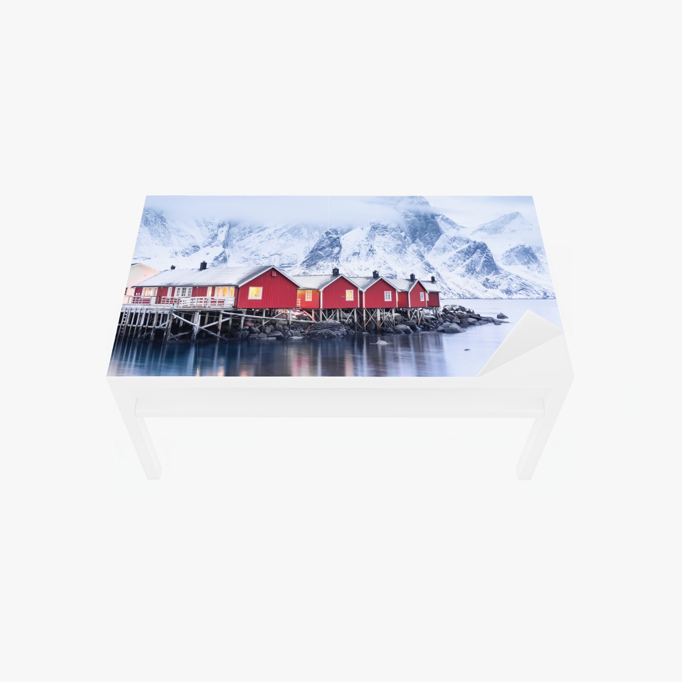 Naklejka na biurko i stół Wschód słońca nad Lofotami i czerwonymi domkami