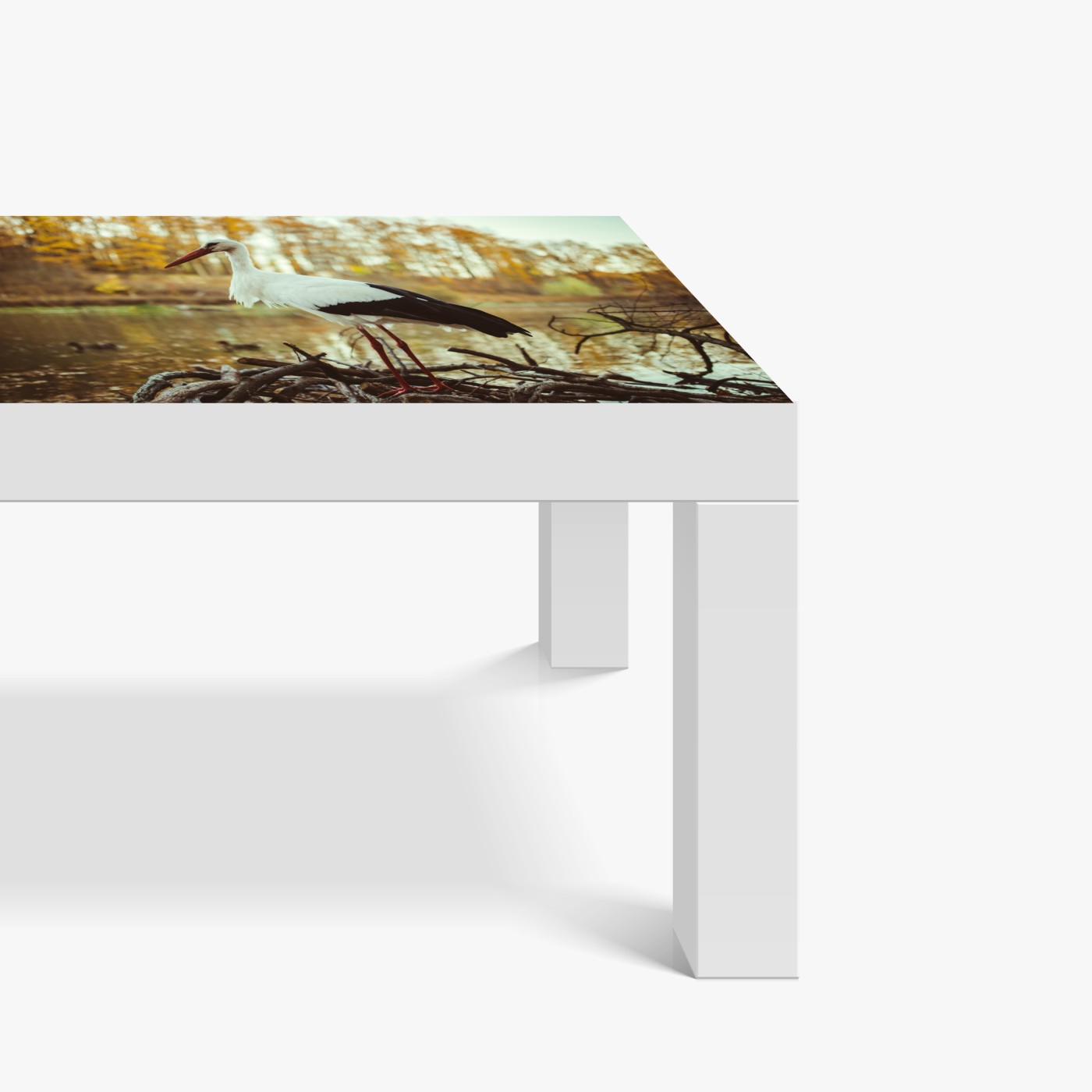 Naklejka na biurko i stół Biały bocian nad jesiennym jeziorem