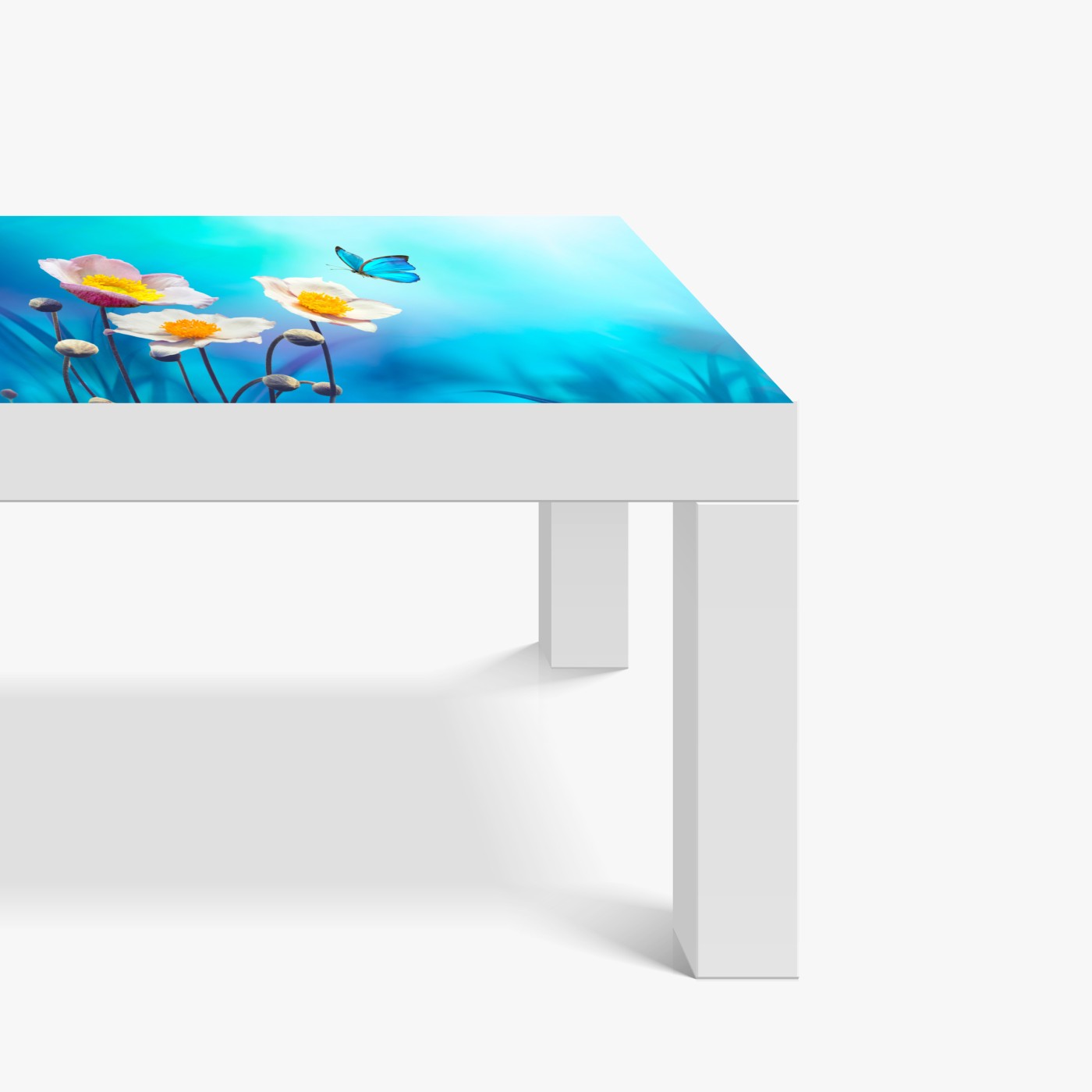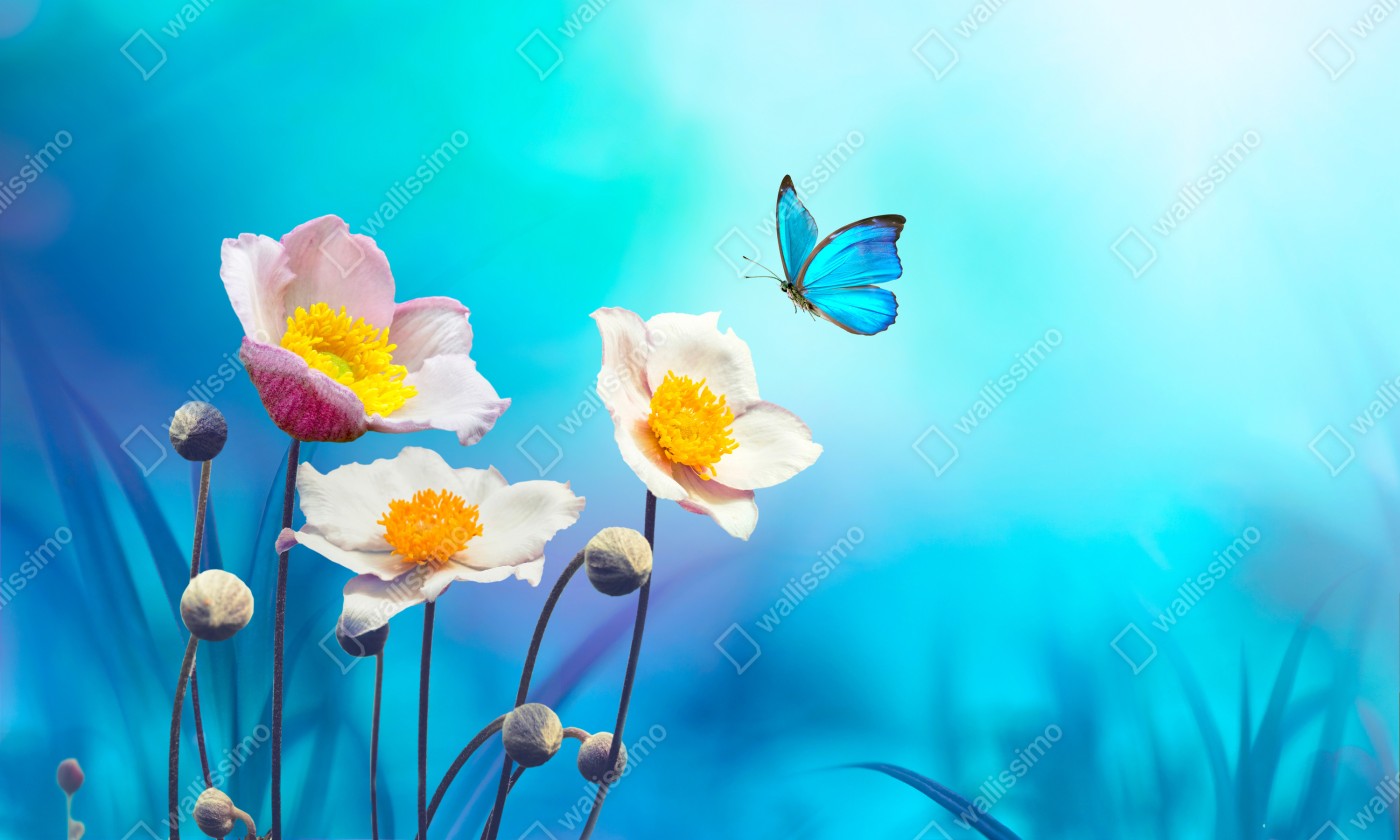 Naklejka na biurko i stół Delikatne różowe anemony i niebieski motyl