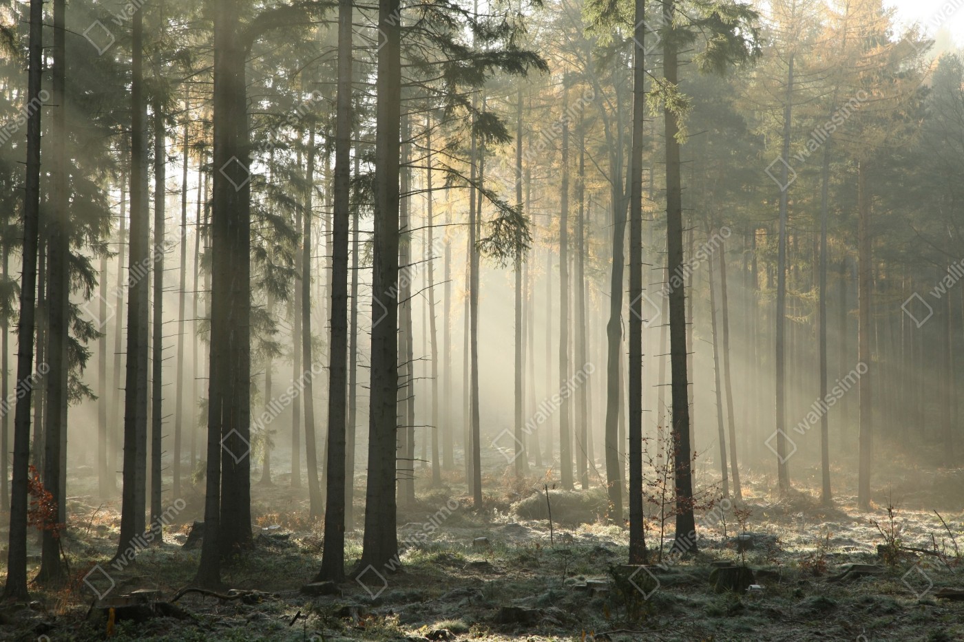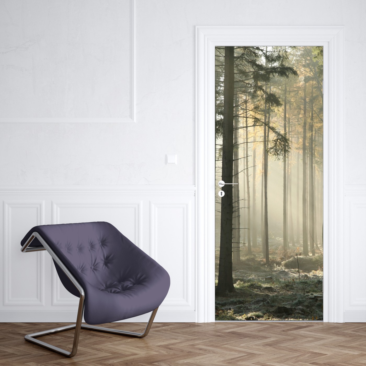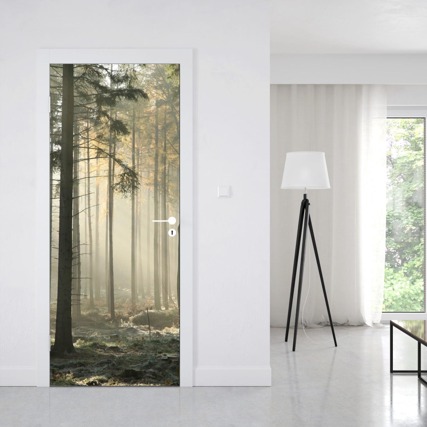 Naklejka na drzwi Mglisty poranek w lesie z promieniami słońca
