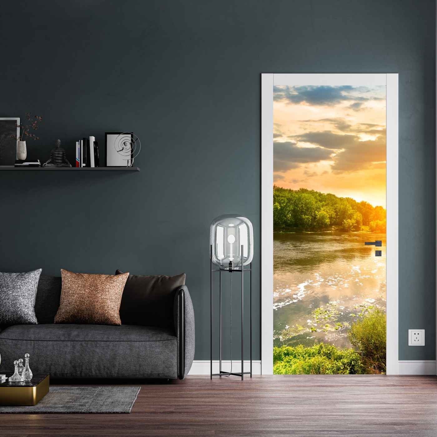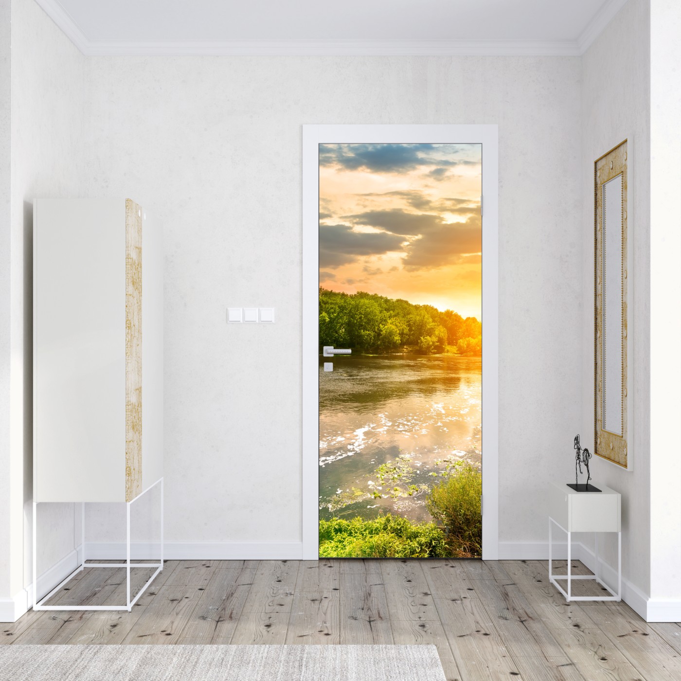 Naklejka na drzwi Spokojny zachód słońca nad rzeką i zielonym lasem