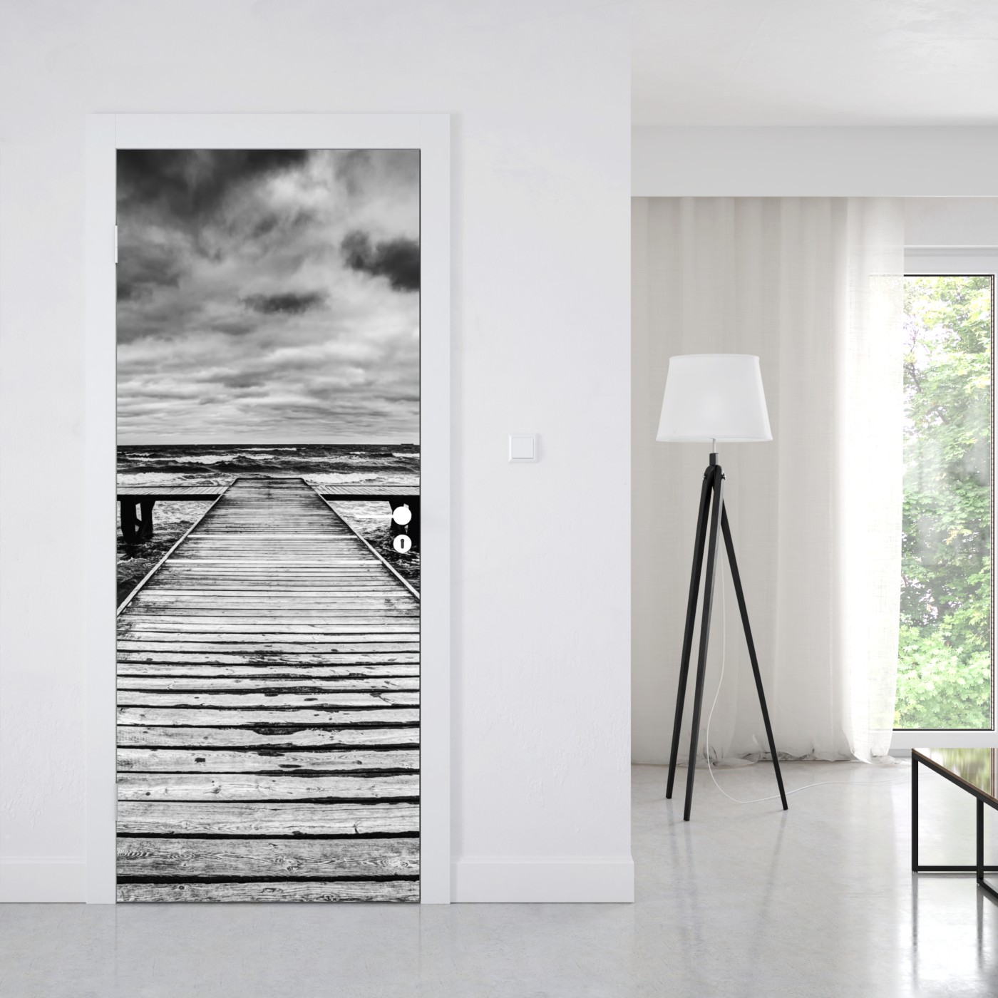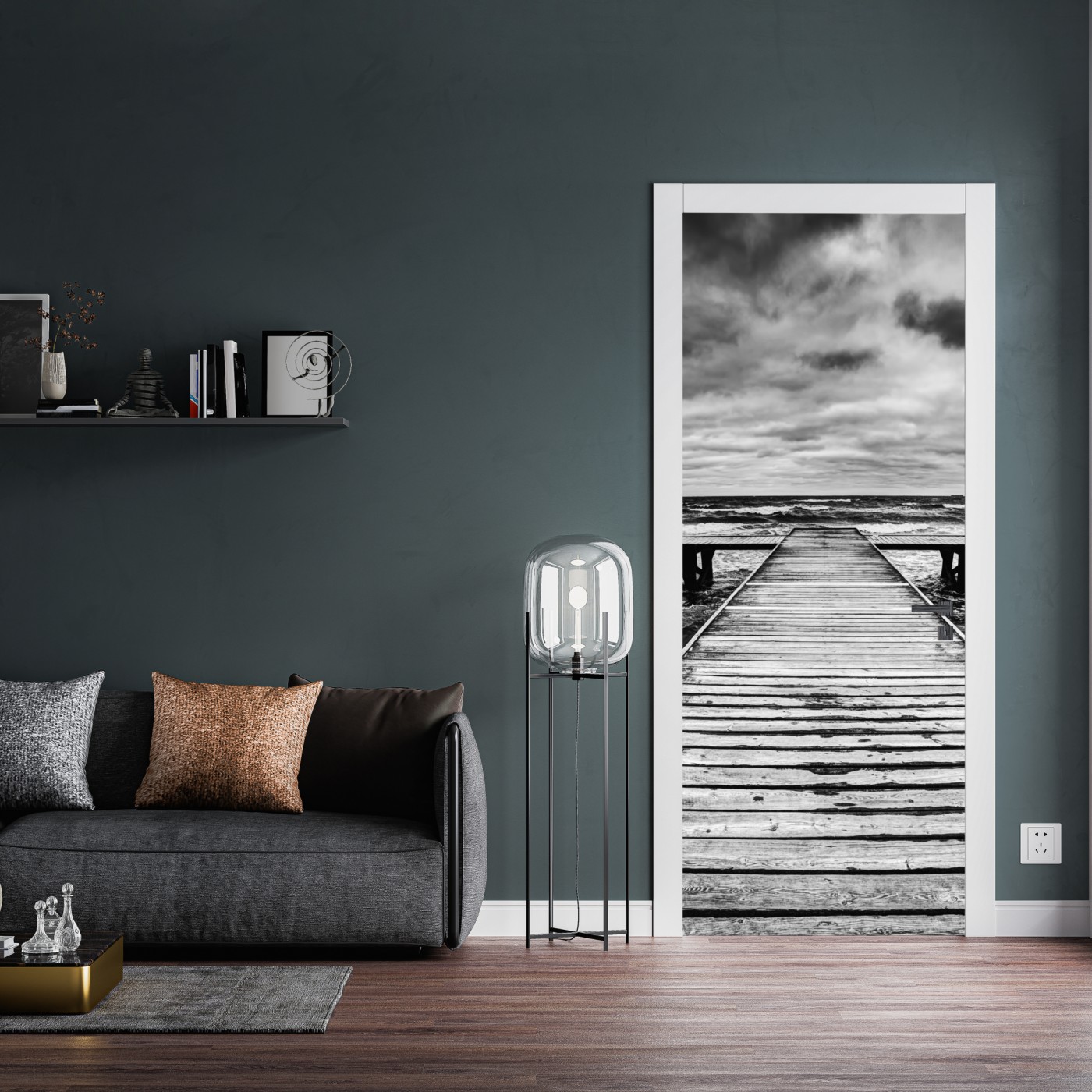 Naklejka na drzwi Dramatyczne czarno-białe molo prowadzące w burzliwe morze