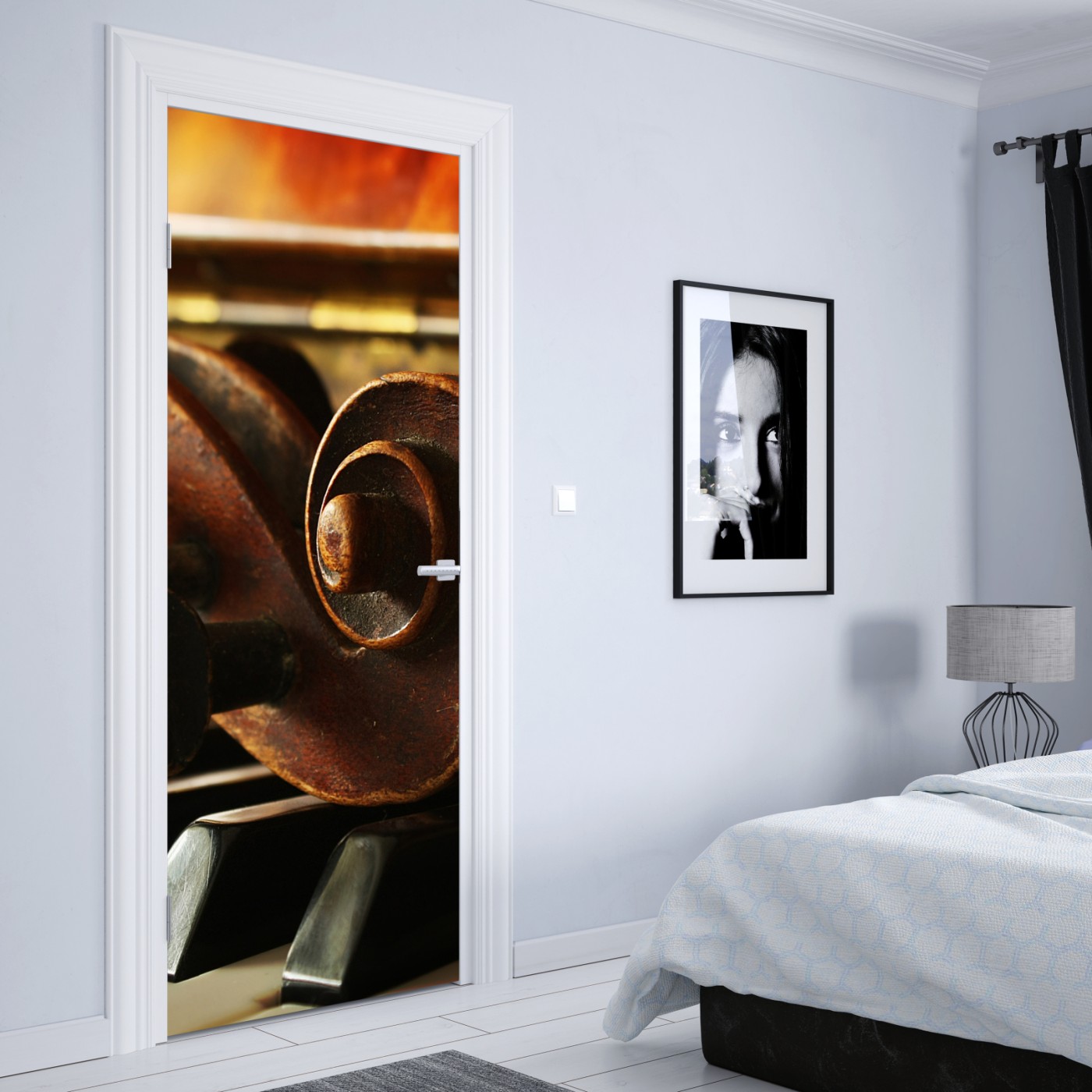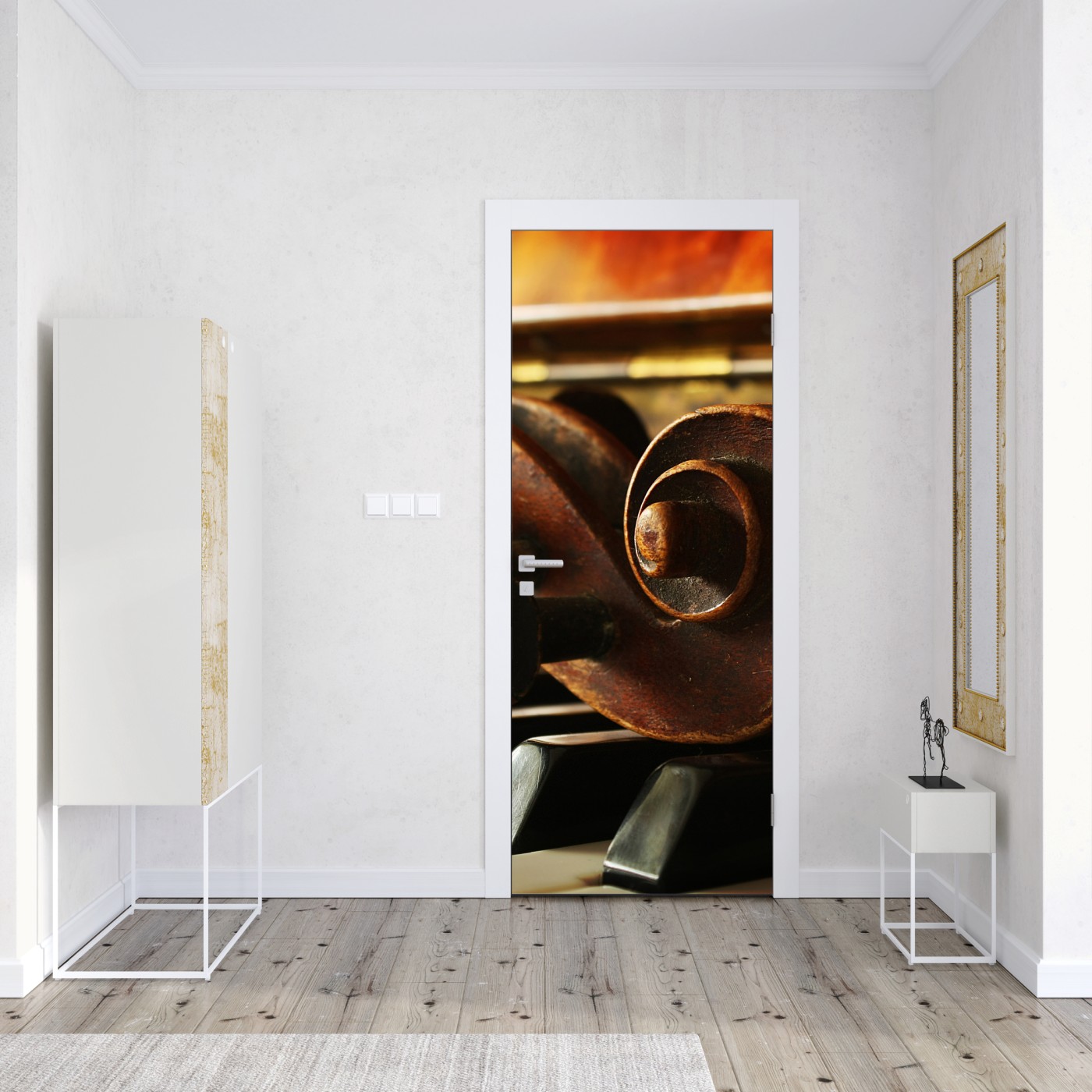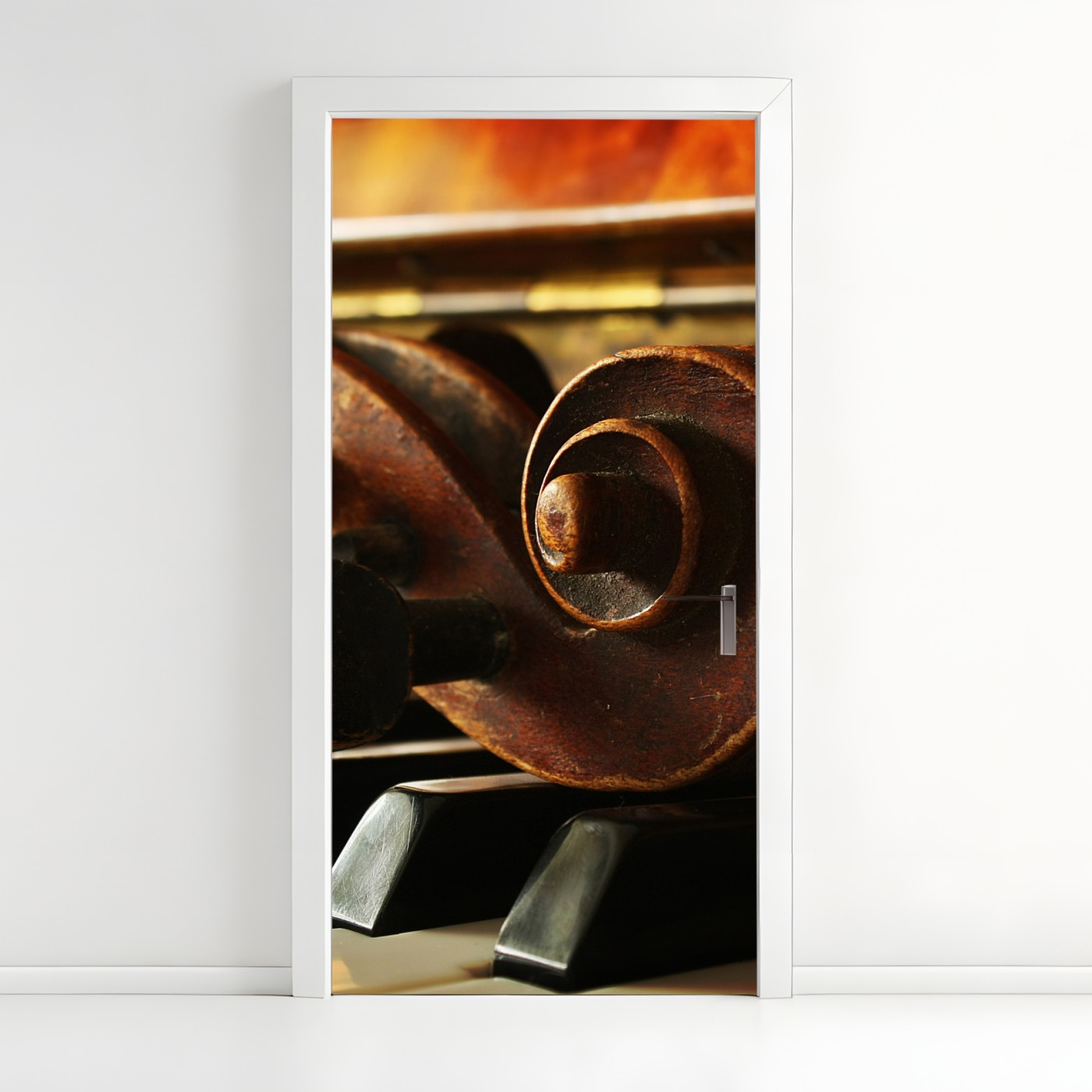 Naklejka na drzwi Zabytkowa główka skrzypiec na klawiszach fortepianu