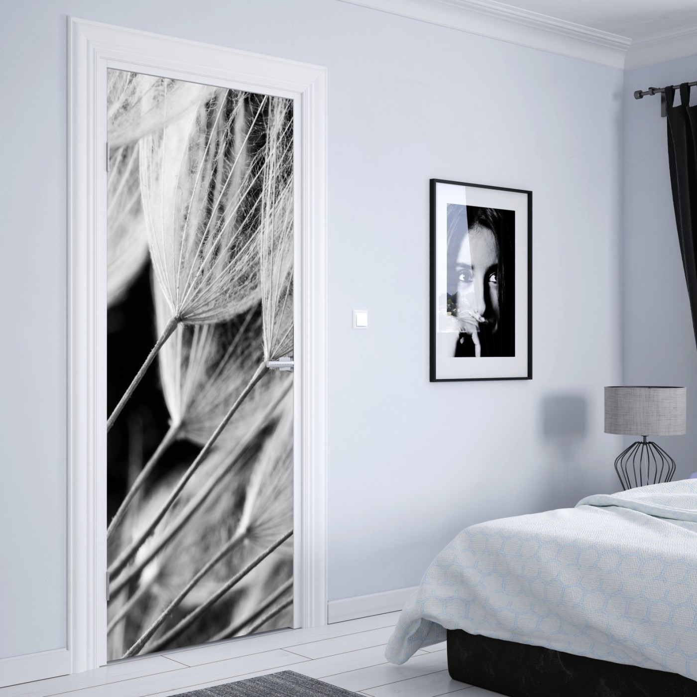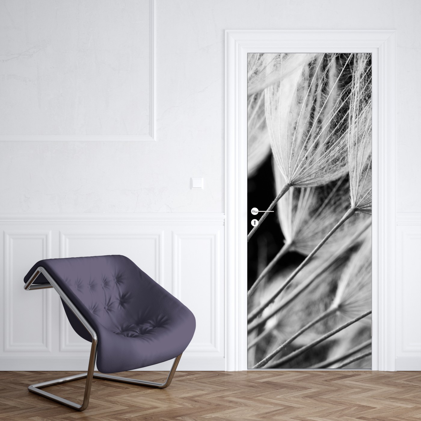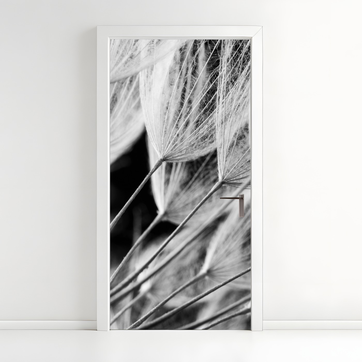 Naklejka na drzwi Delikatne zbliżenie nasion dmuchawca czarno-białe
