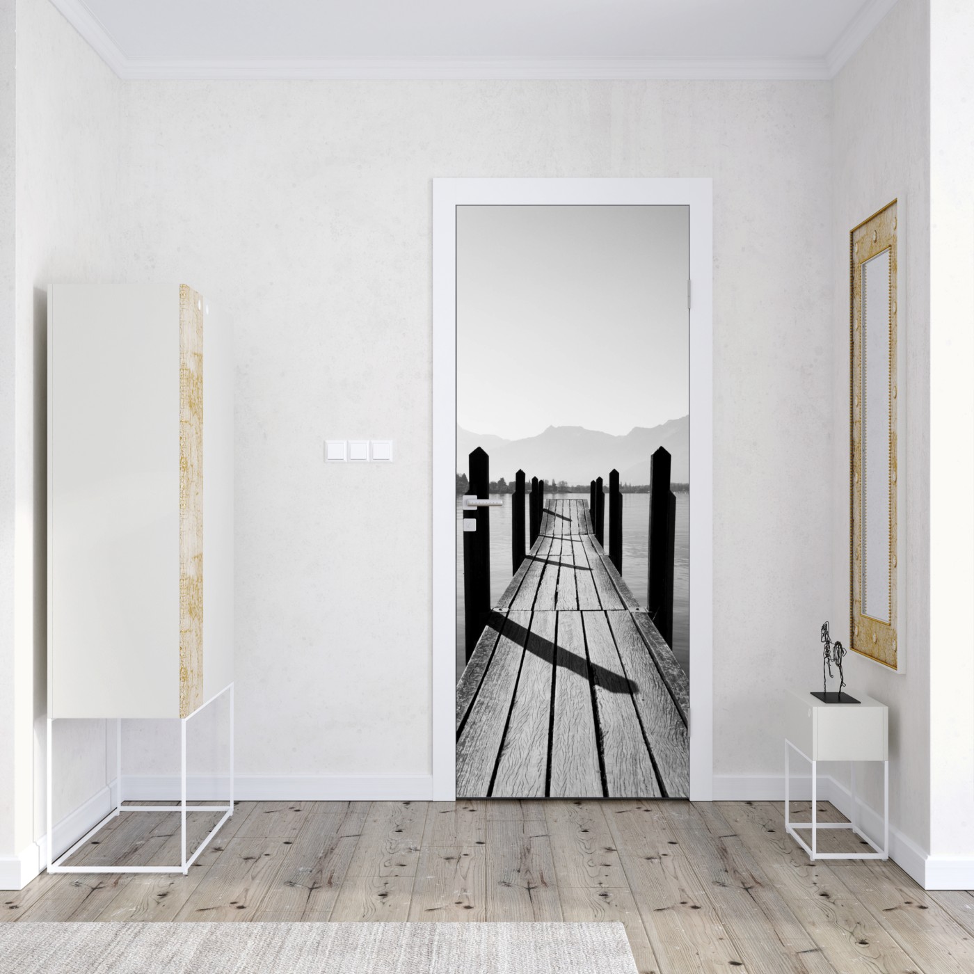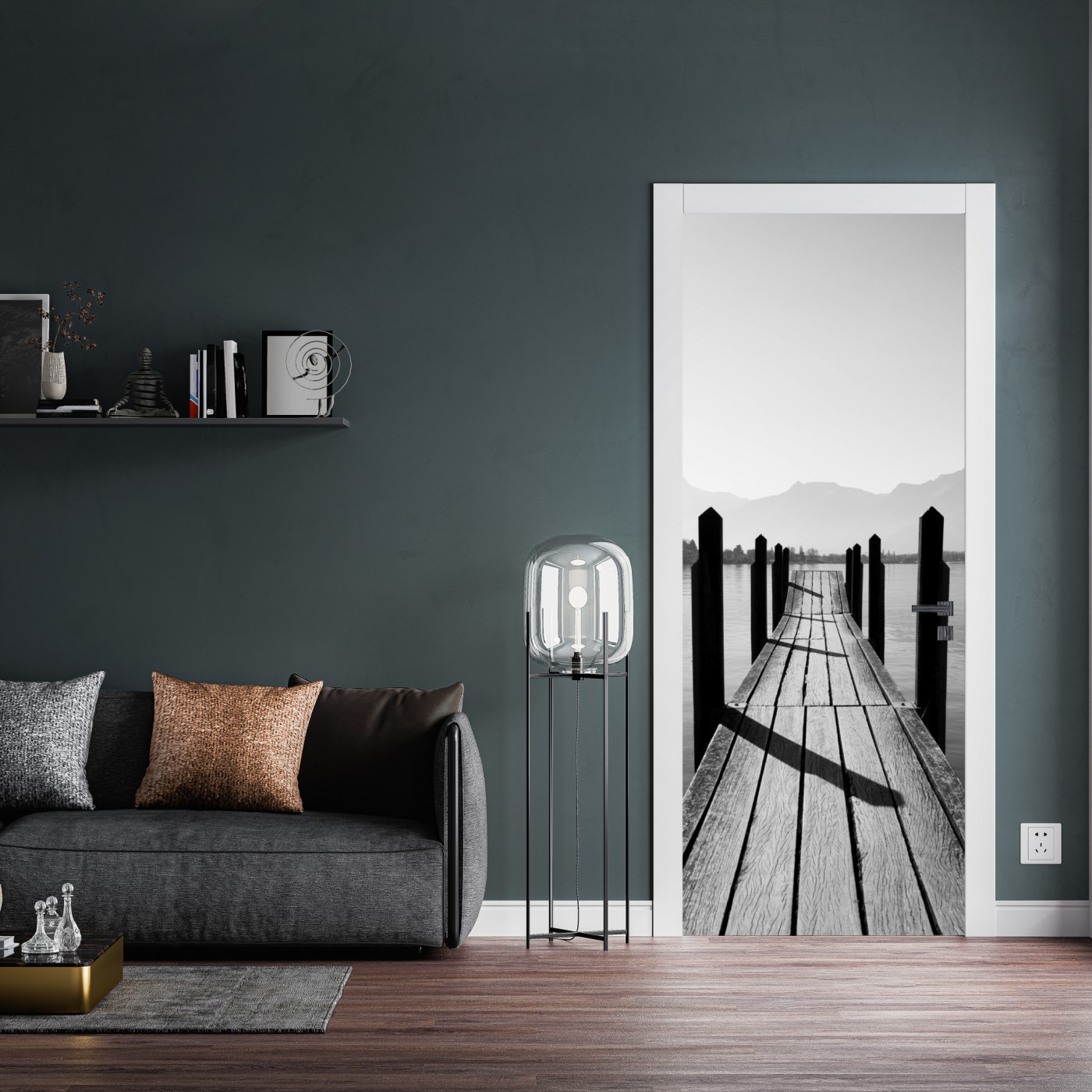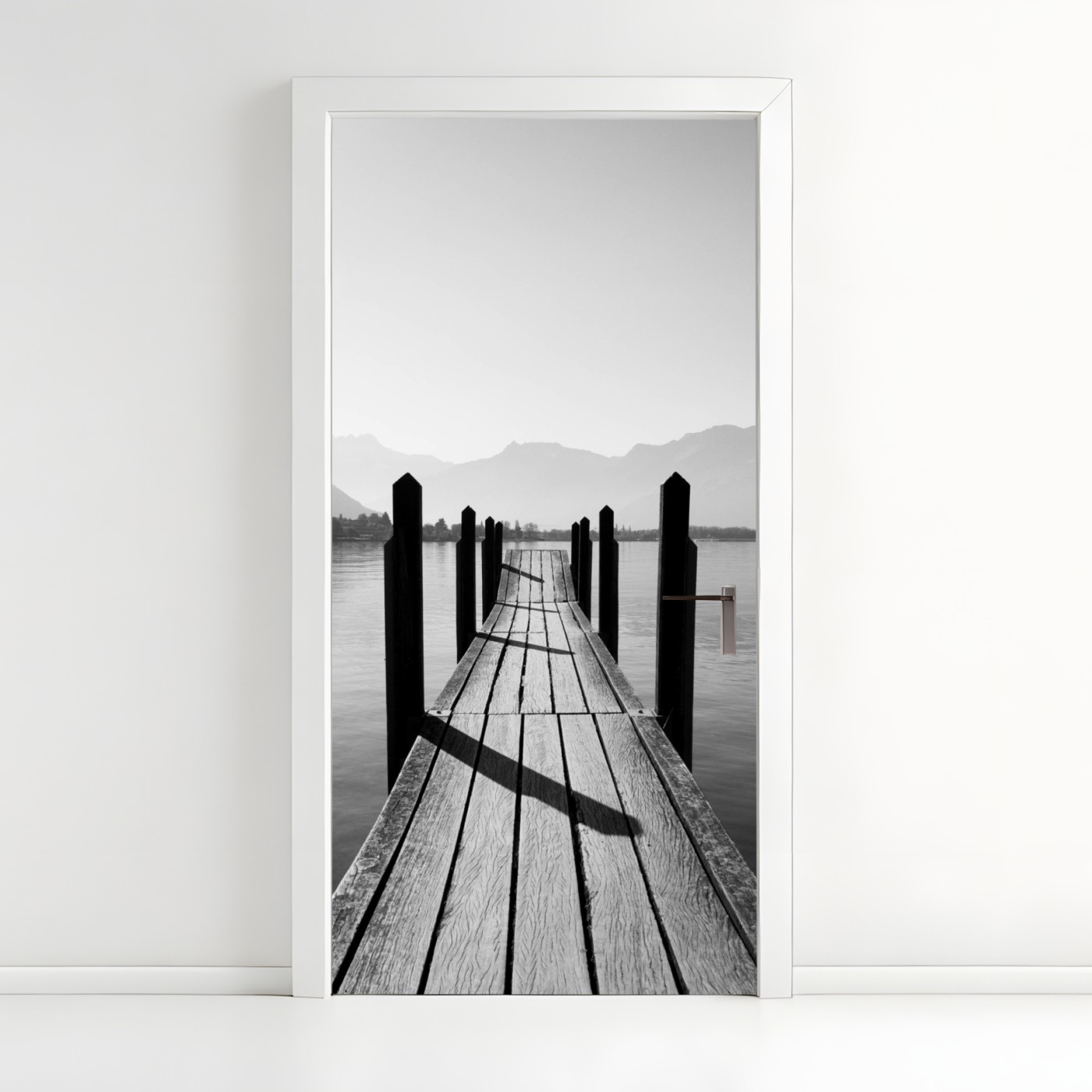 Naklejka na drzwi Spokojny pomost nad jeziorem w czerni i bieli