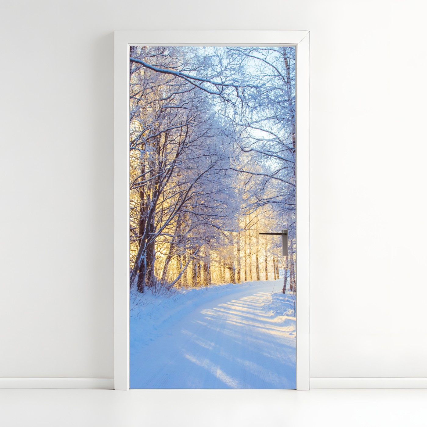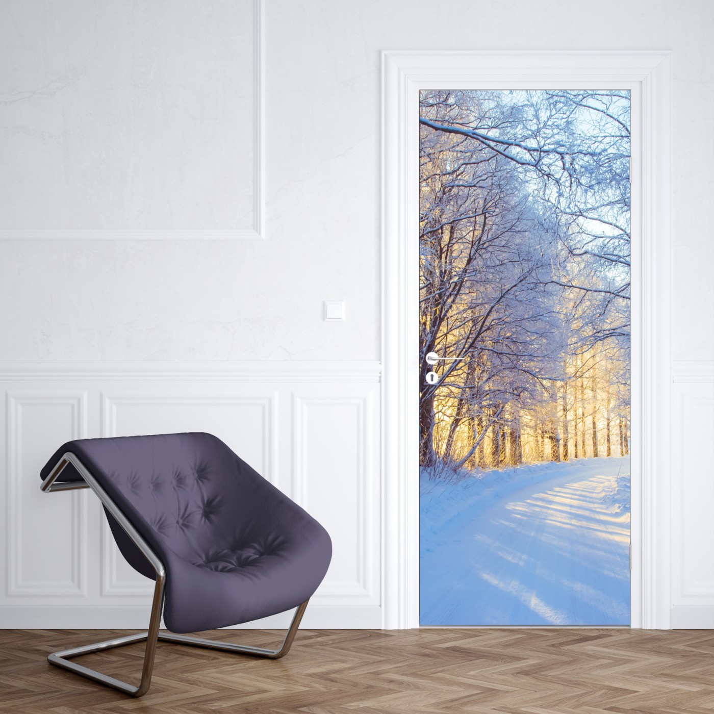 Naklejka na drzwi Zimowy las brzozowy ze złotym świtem