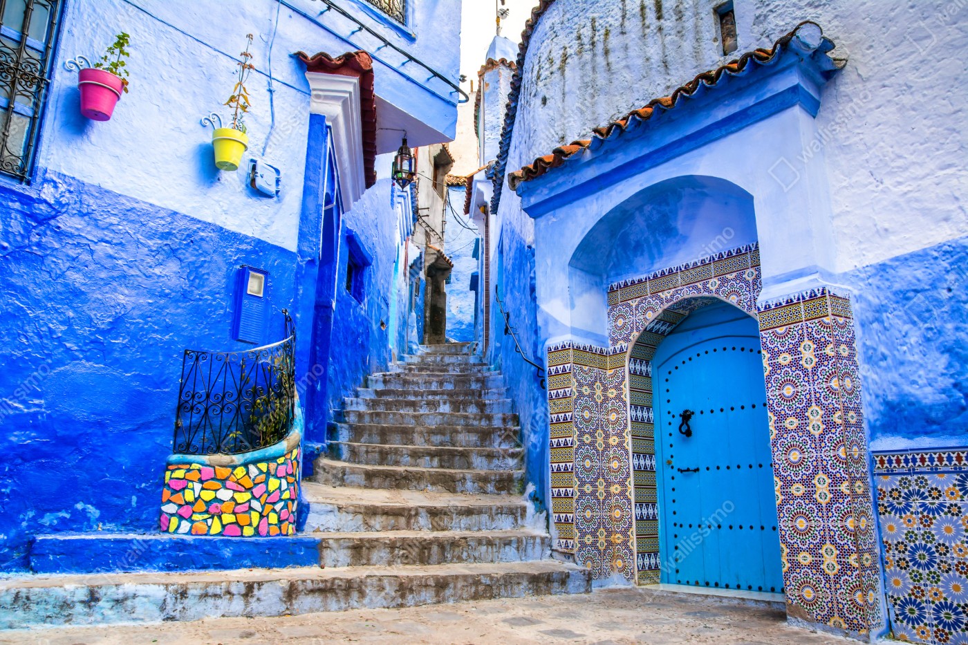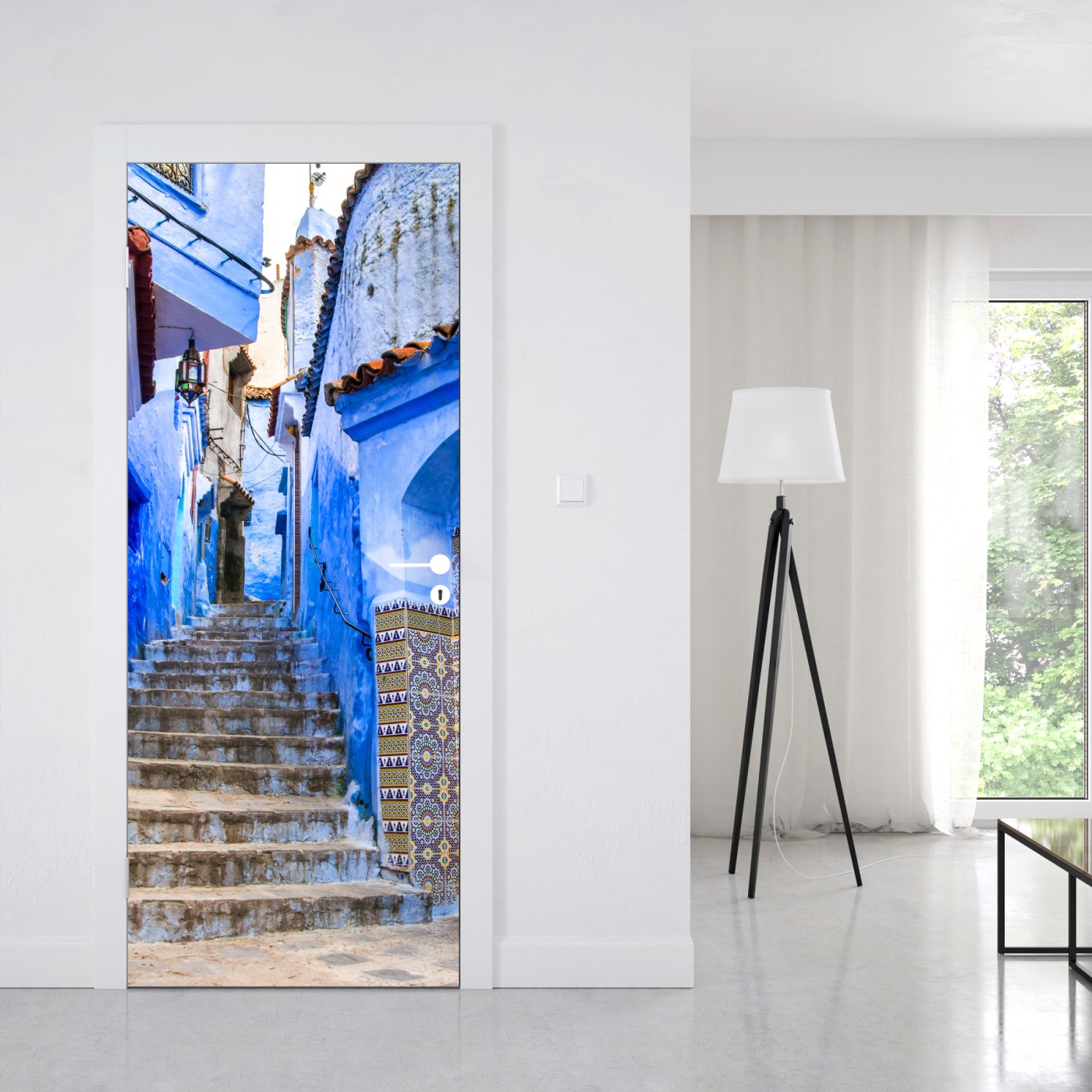Naklejka na drzwi Niebieska uliczka w Chefchaouen, Maroko