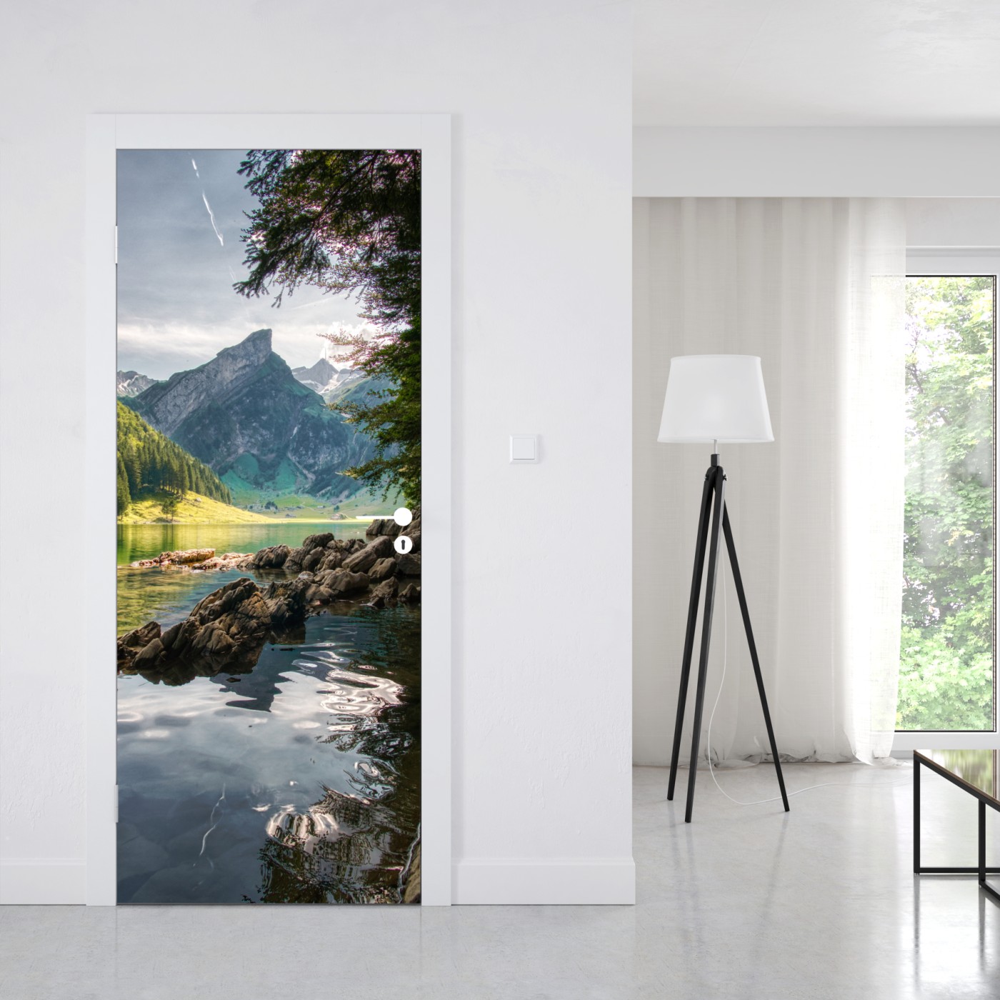 Naklejka na drzwi Spokojne górskie jezioro z odbiciami lasu