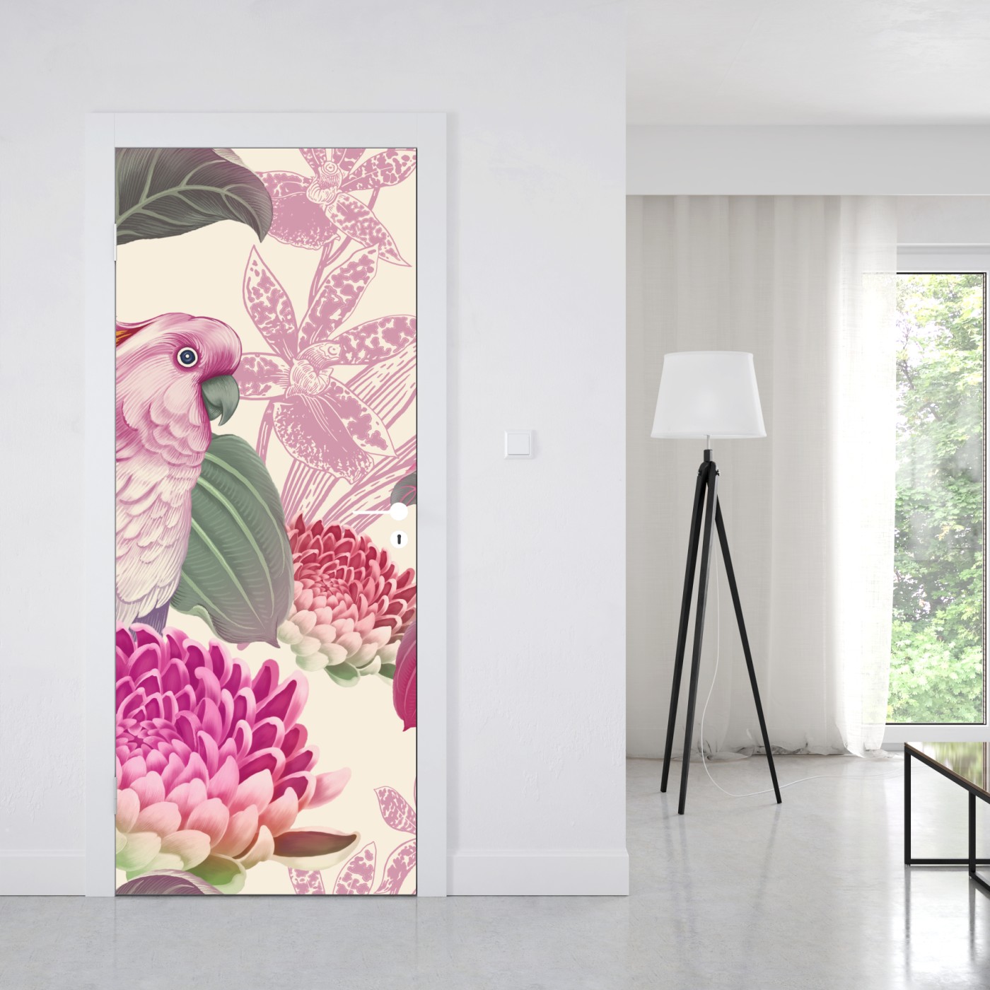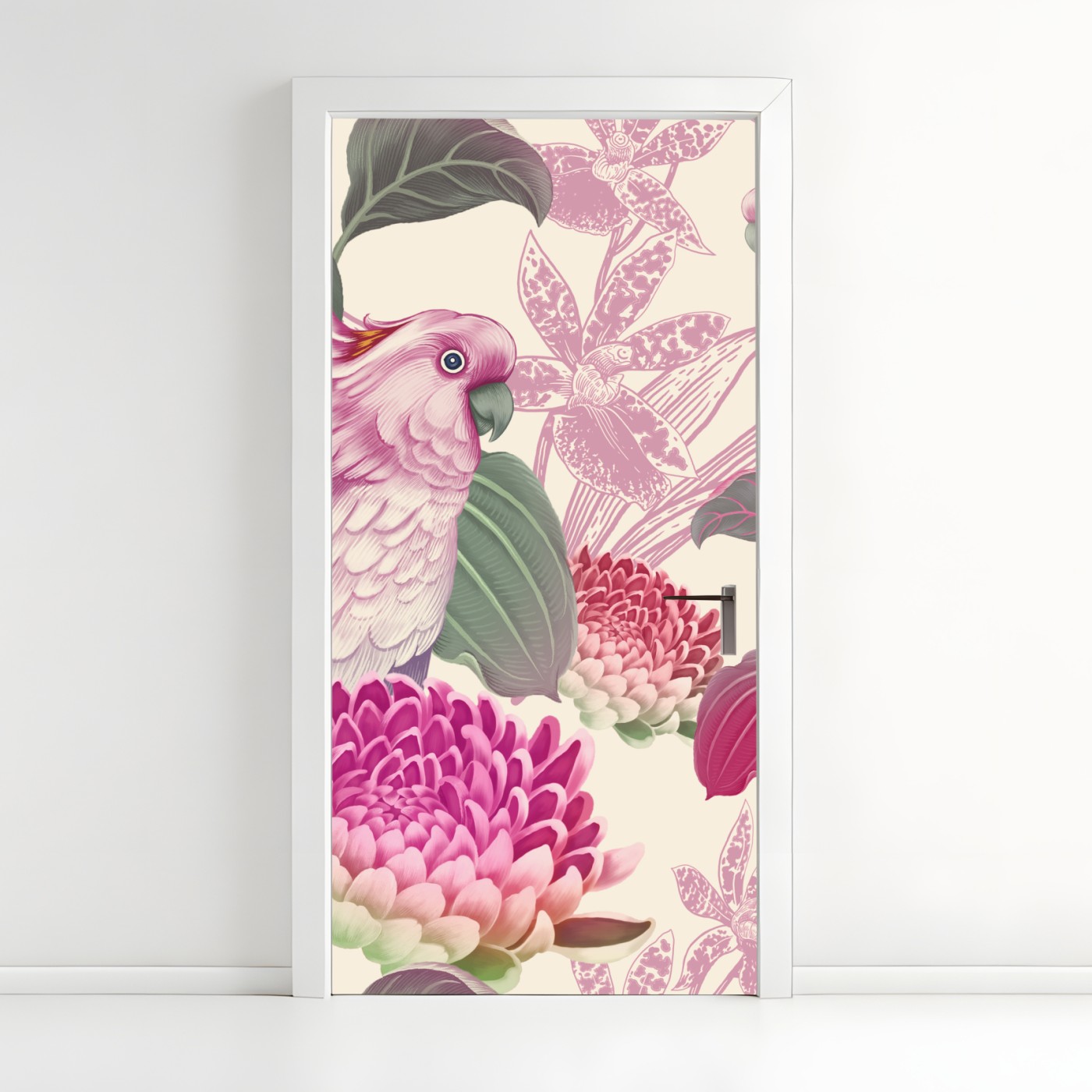 Naklejka na drzwi Różowa papuga i chryzantema - botaniczny motyw