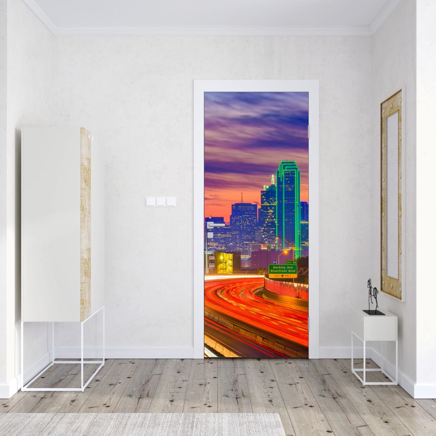 Naklejka na drzwi Panorama Dallas o zachodzie słońca z świetlnymi smugami autostrady