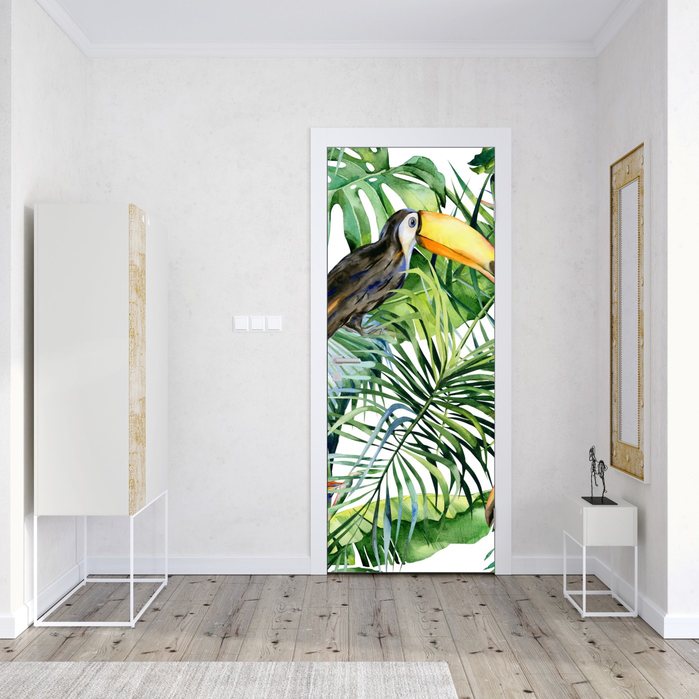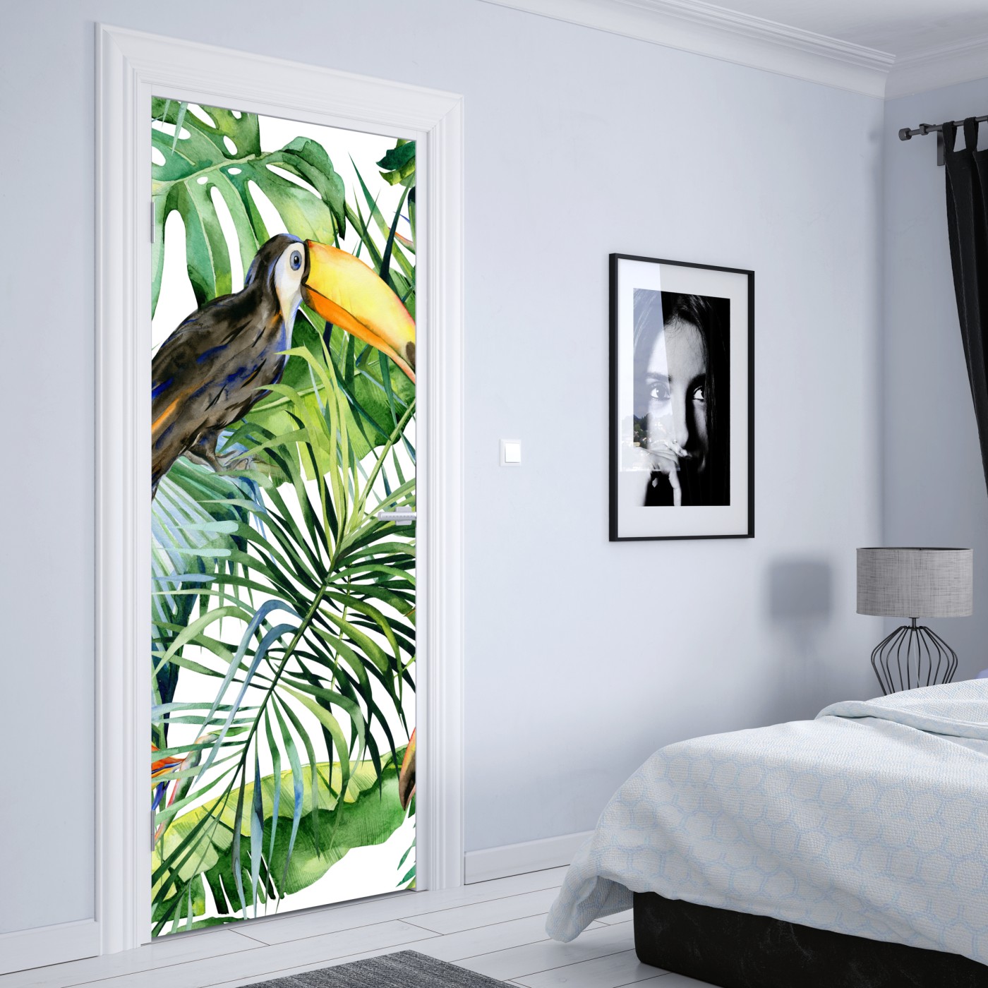 Naklejka na drzwi Akwarelowy tukan w tropikalnym wzorze