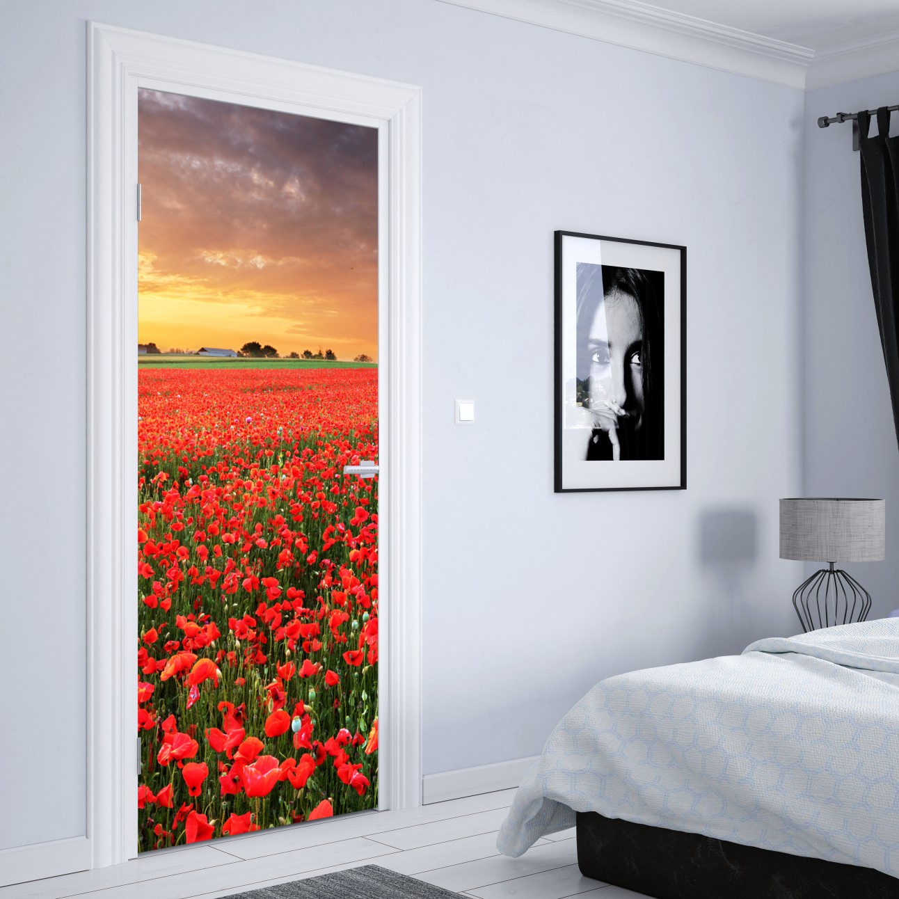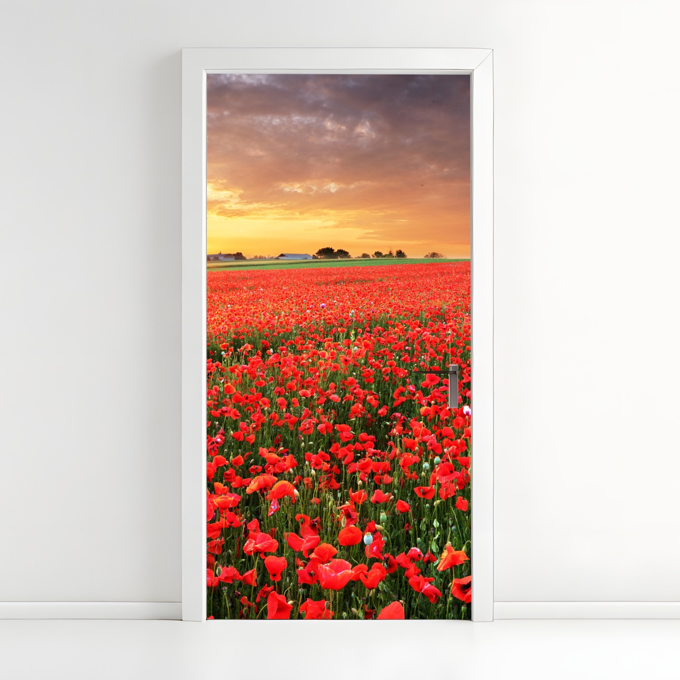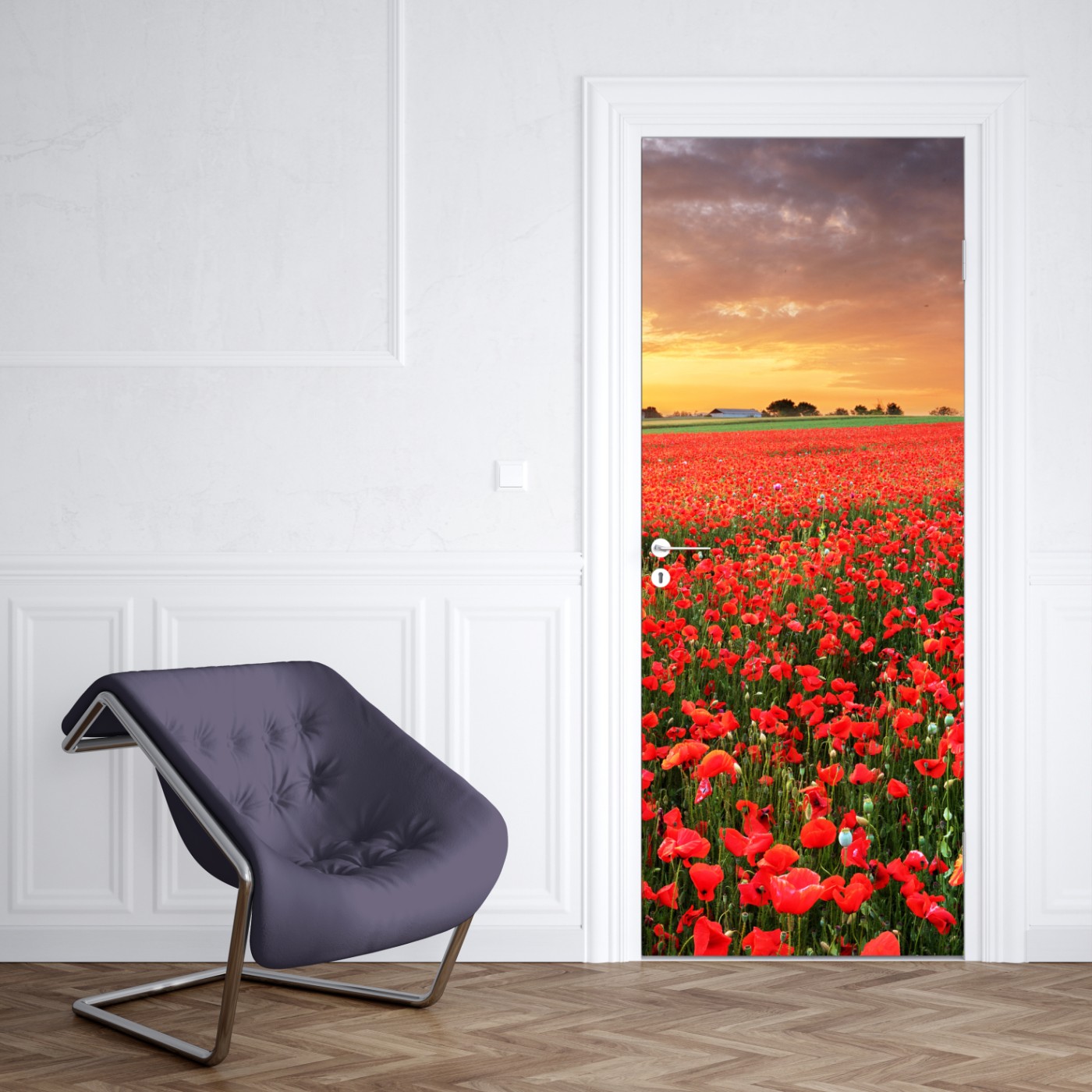 Naklejka na drzwi Pole maków o zachodzie słońca