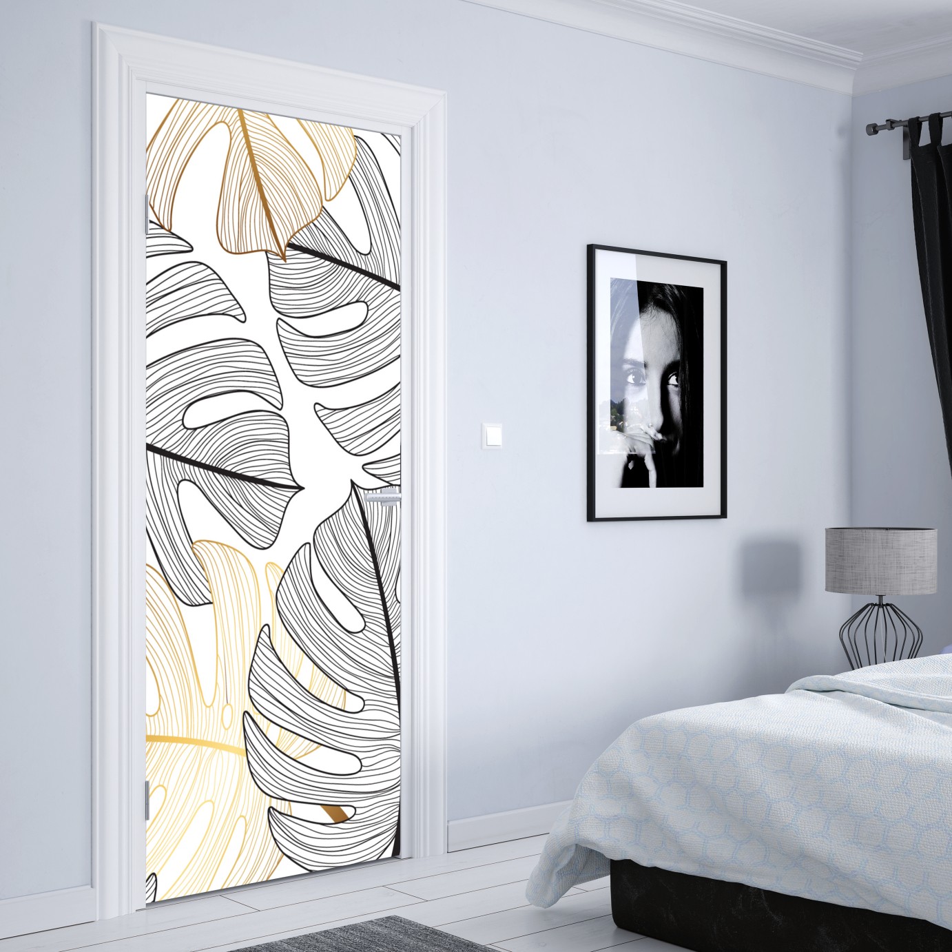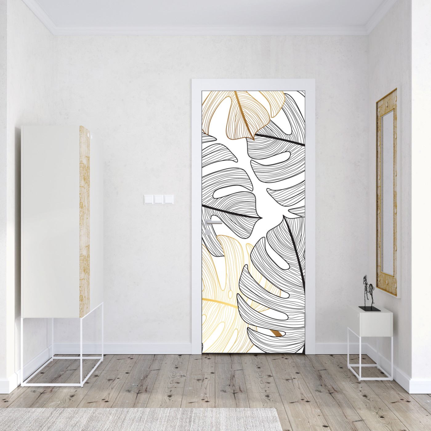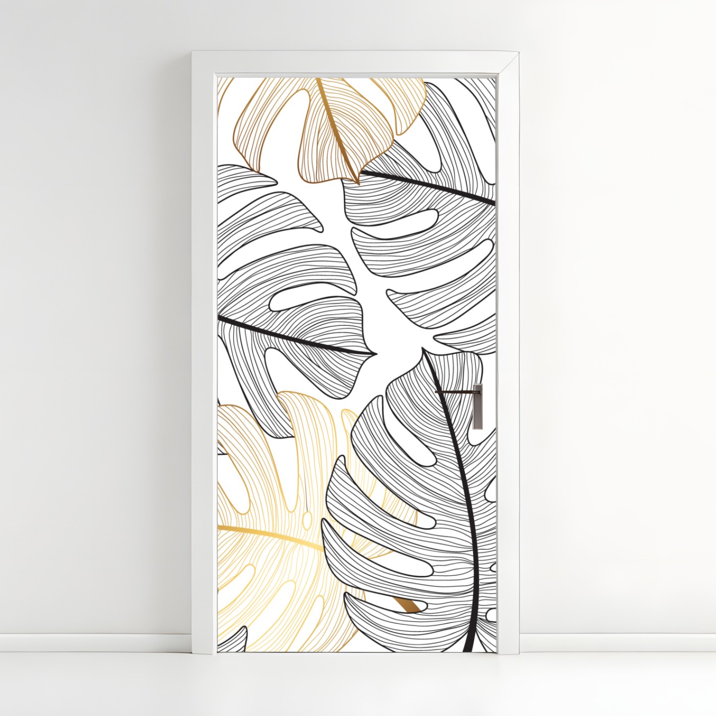 Naklejka na drzwi Wzór liści monstera ze złotymi akcentami
