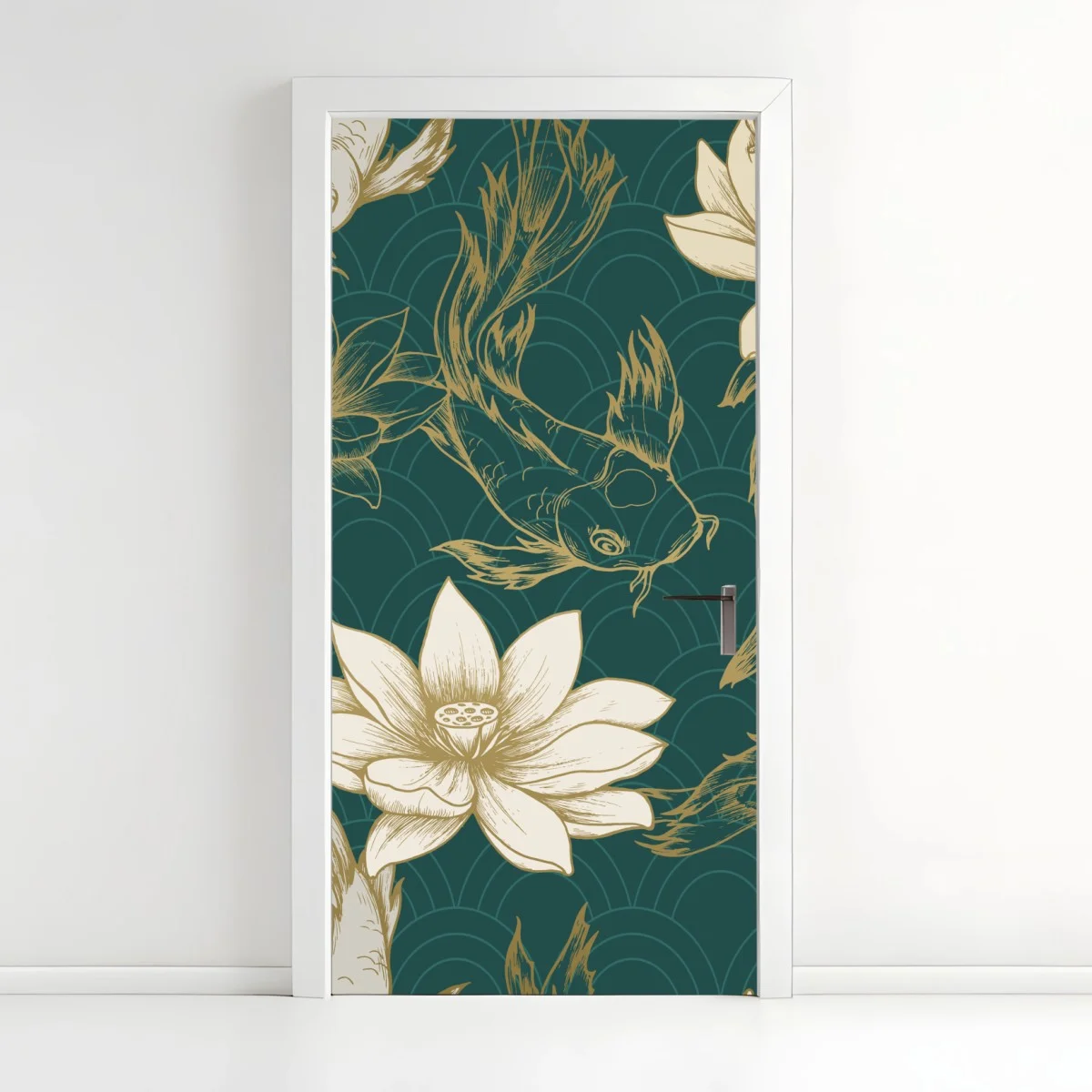 Naklejka na drzwi Orientalny wzór koi i lotosów w turkusie i złocie
