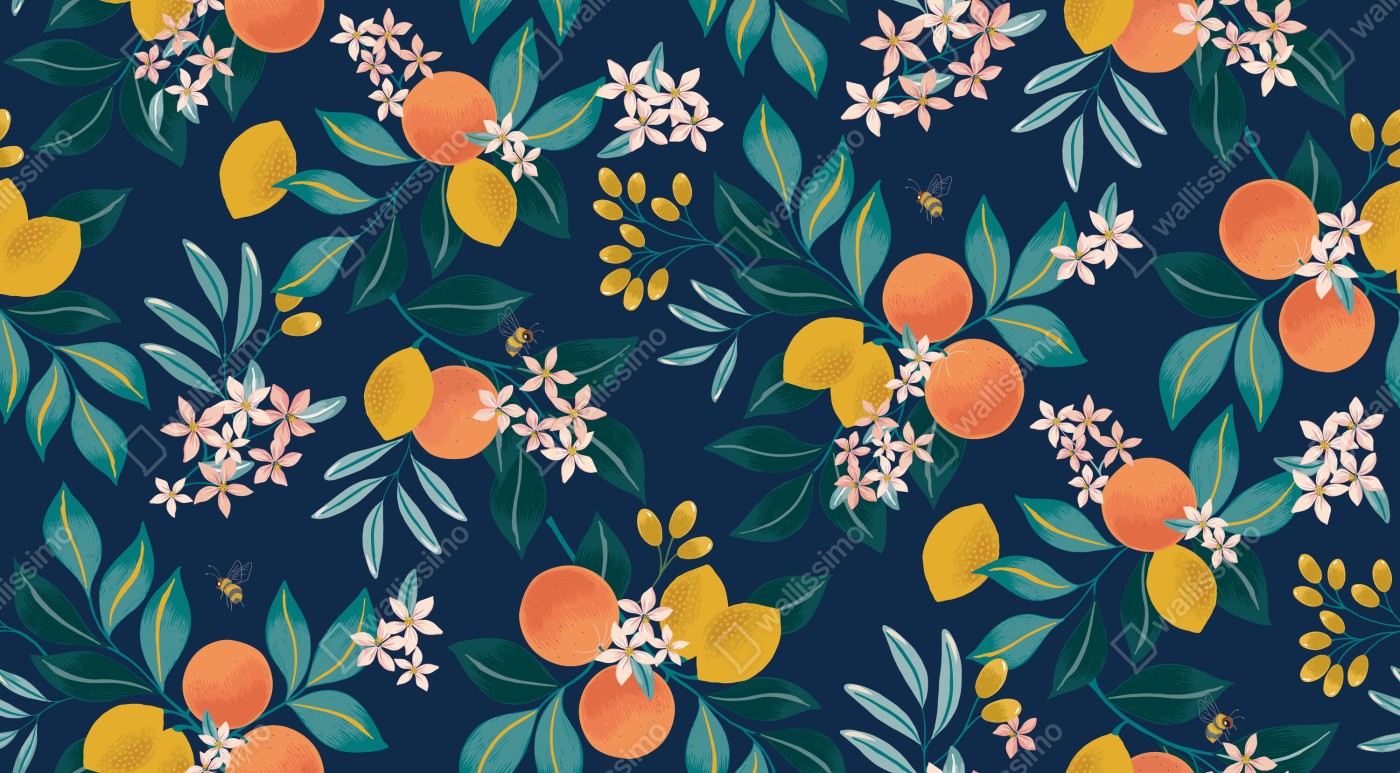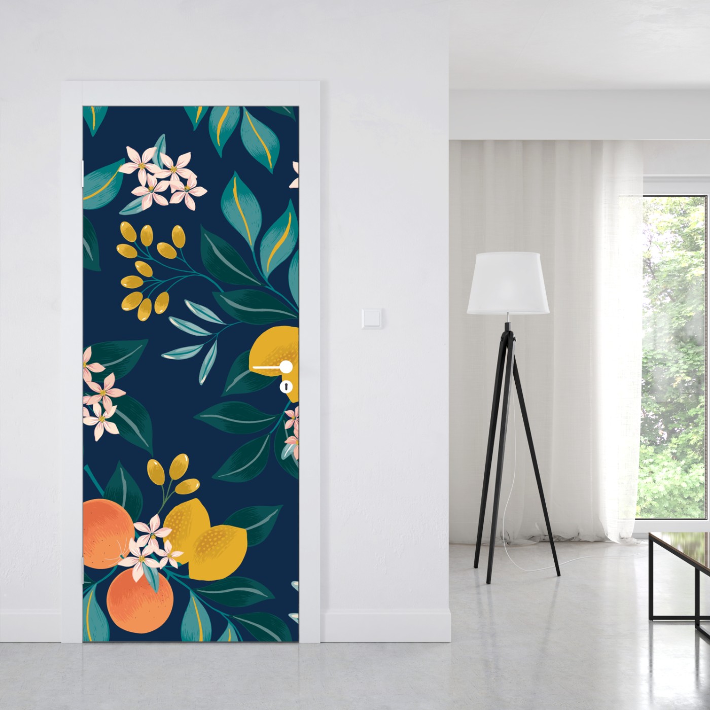 Naklejka na drzwi Botaniczny wzór z kwiatami cytrusów na granatowym tle