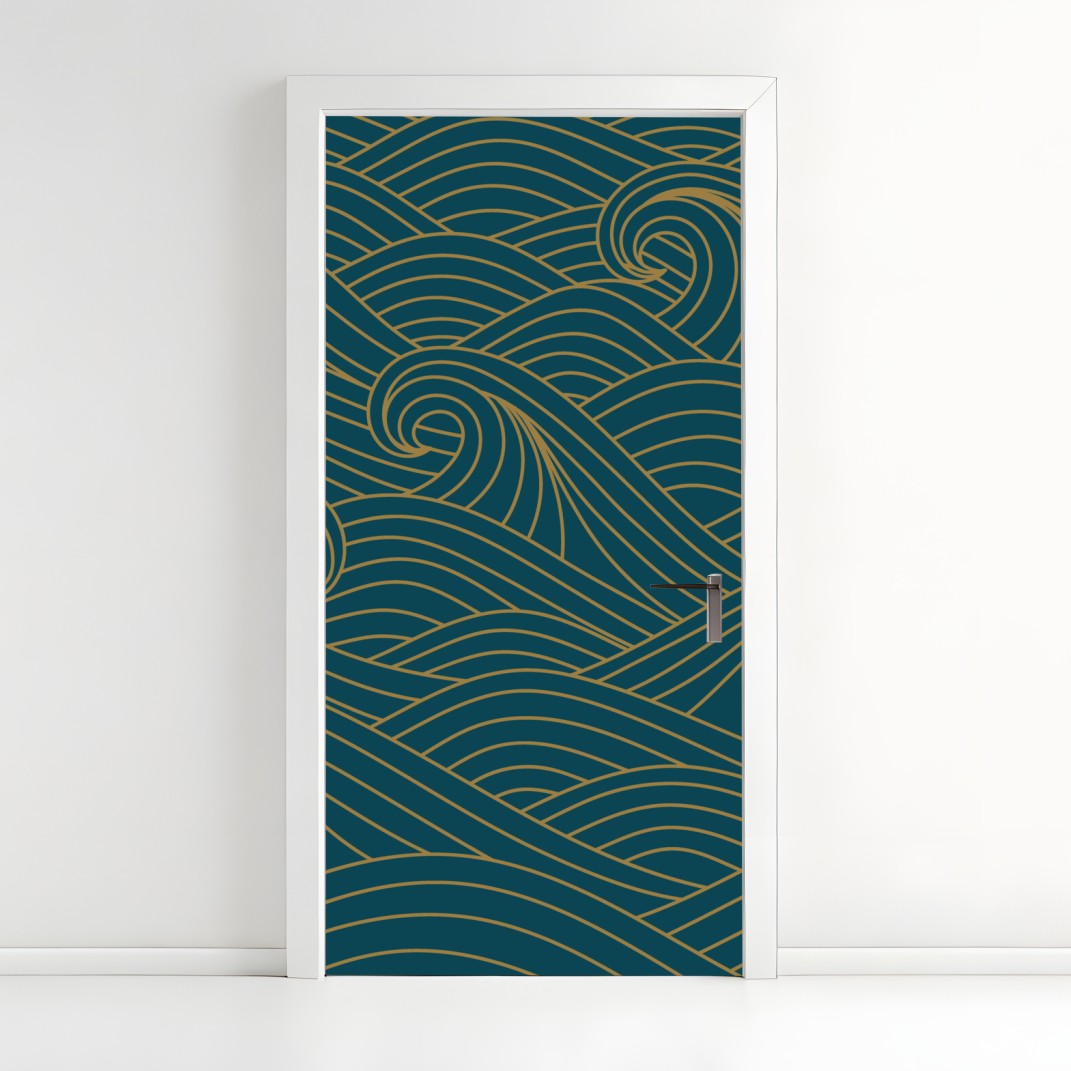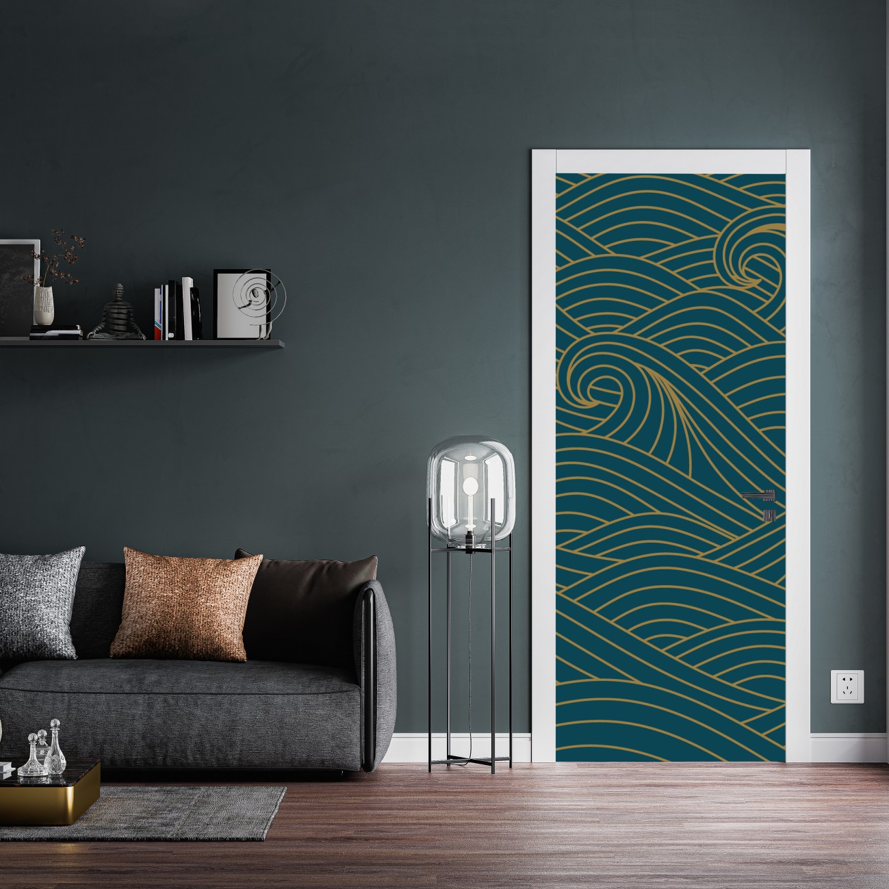 Naklejka na drzwi Turkusowy wzór fal ze złotymi liniami