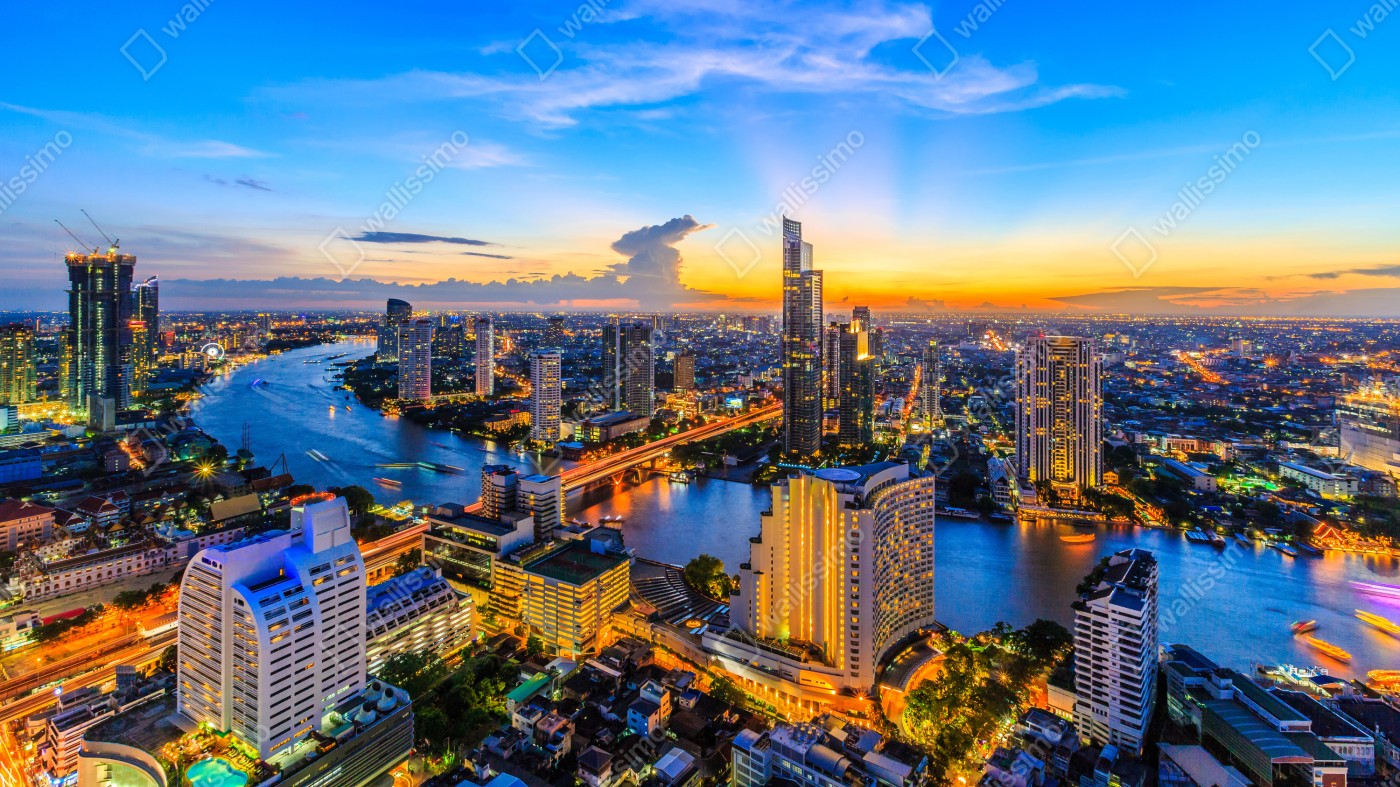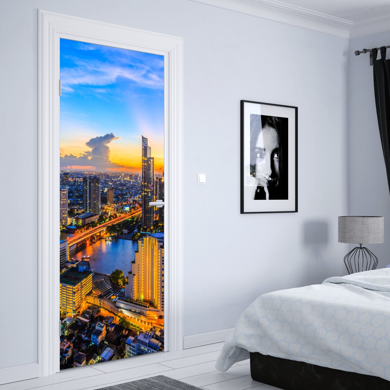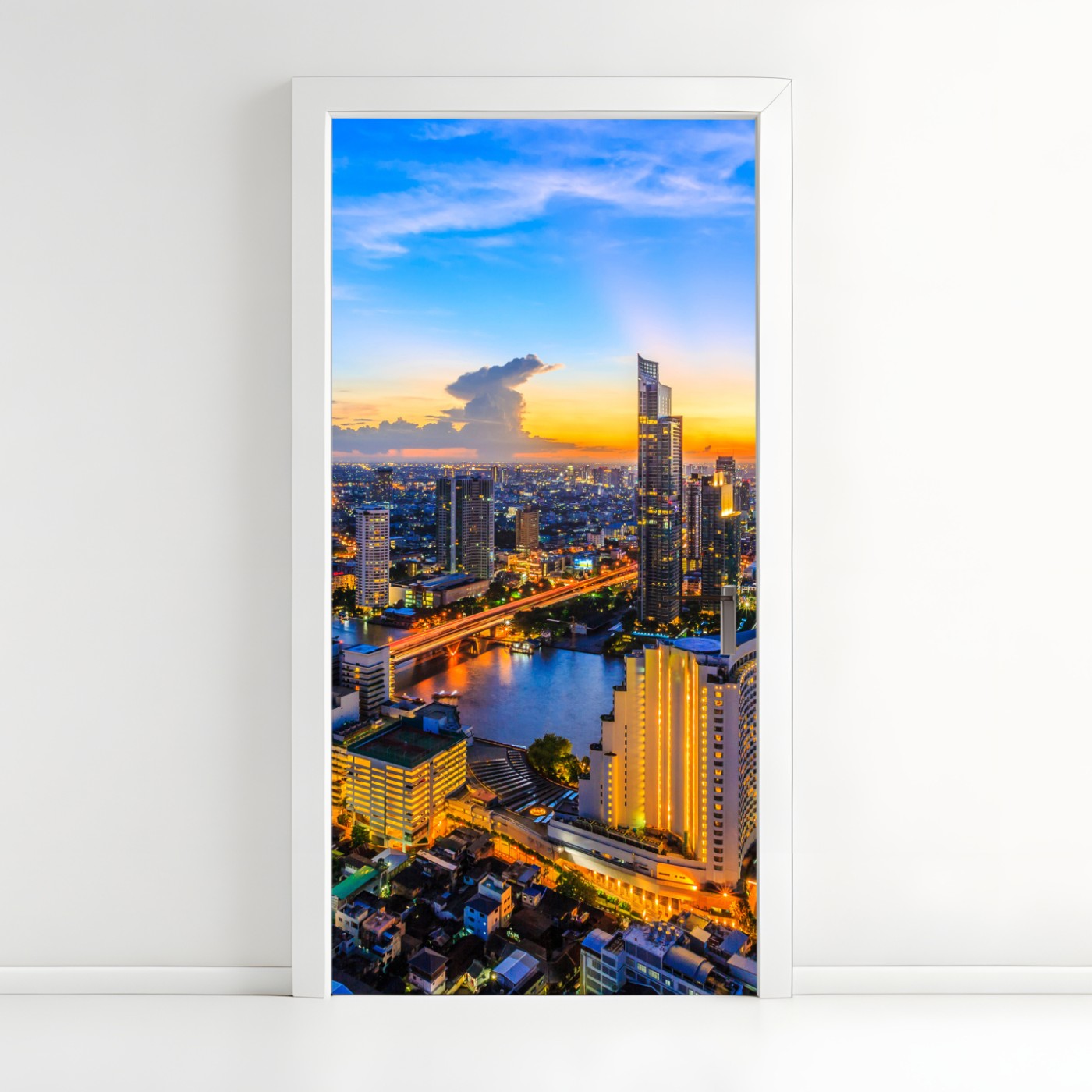 Naklejka na drzwi Tętniąca życiem panorama miasta o zmierzchu