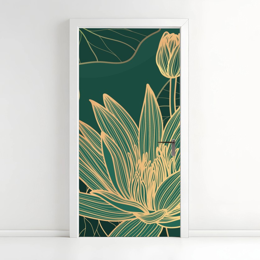 Naklejka na drzwi Złote kwiaty lotosu na zielonym tle