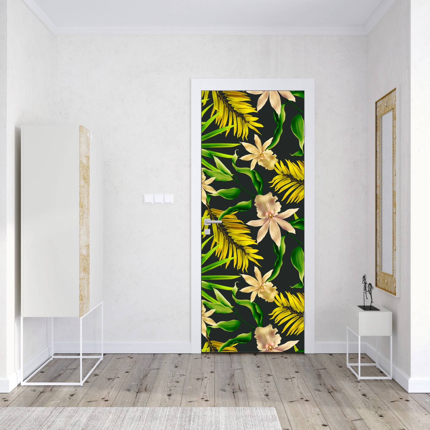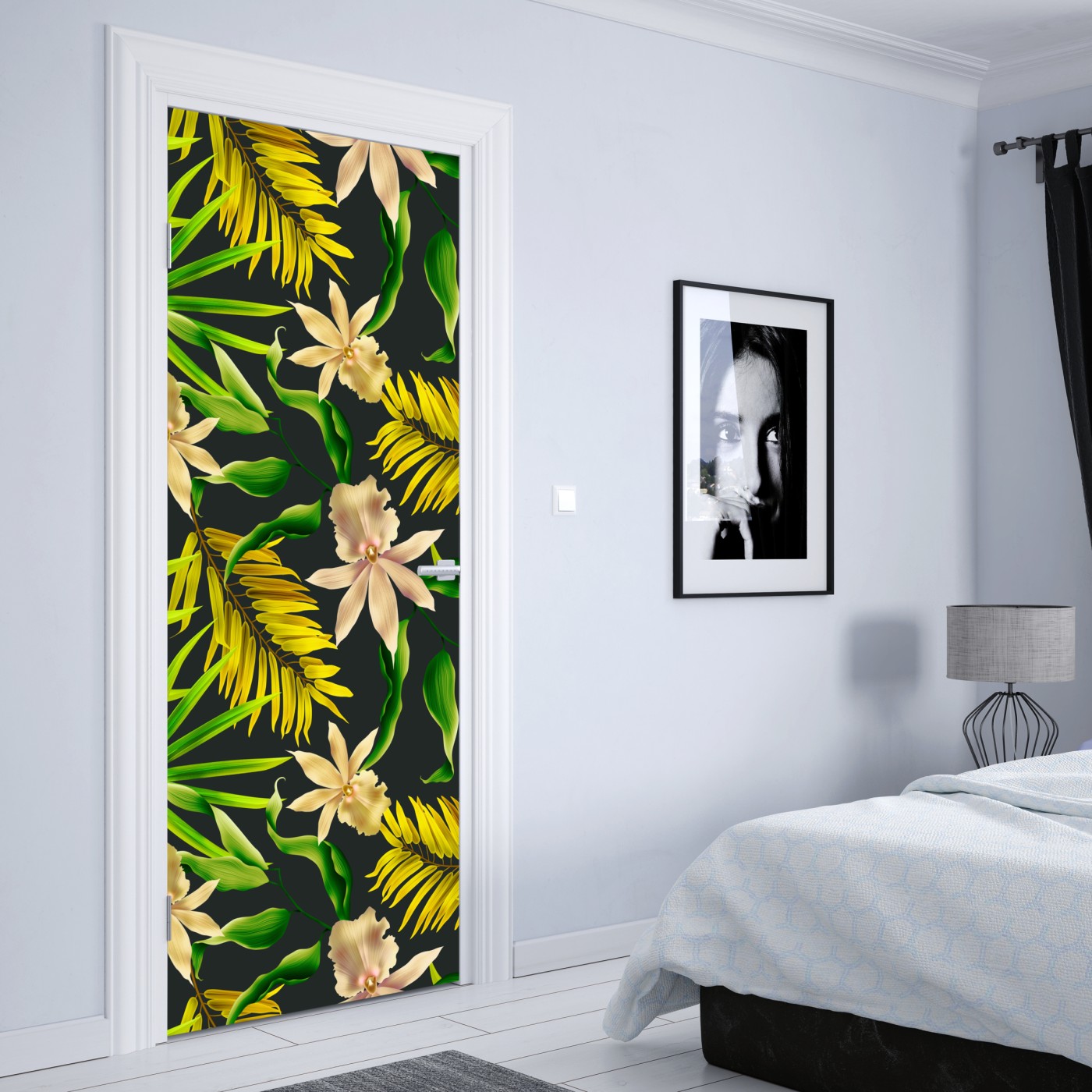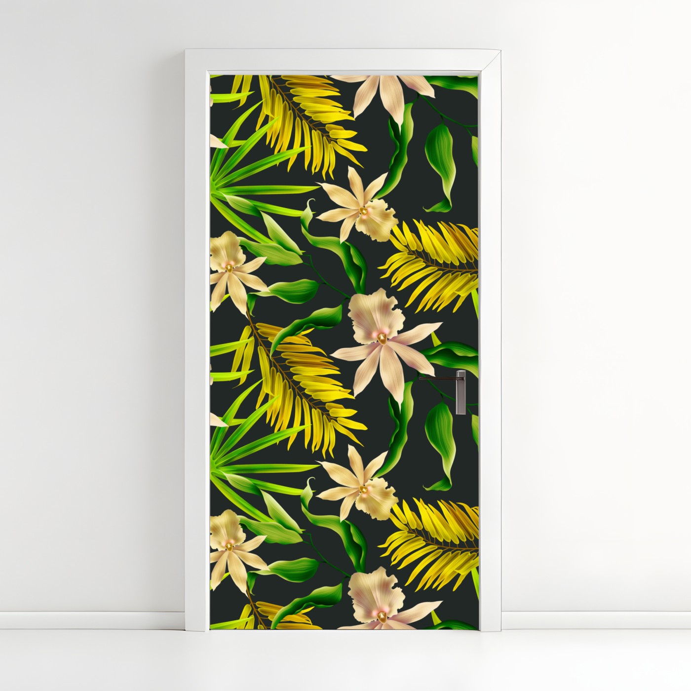 Naklejka na drzwi Tropikalny wzór storczyków na ciemnym tle